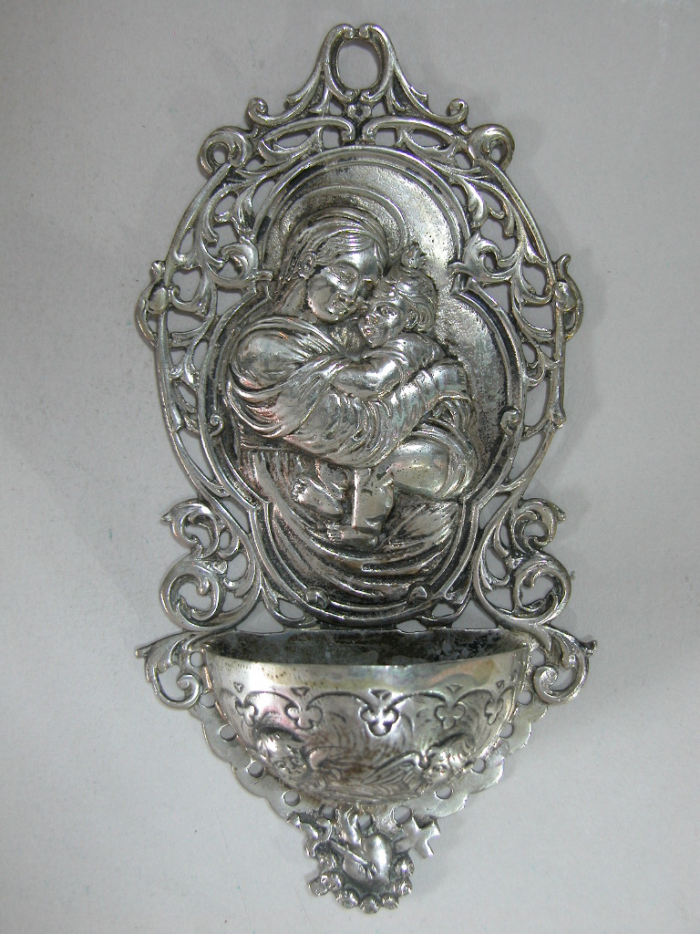 Wijwaterbakje met Maria met kind, op bakje twee cherubkopjes