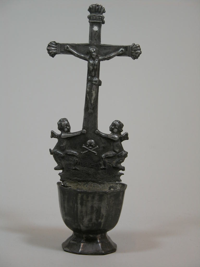 Wijwaterbakje met Christus aan het kruis, geflankeerd door twee putti, met zeshoekig bakje