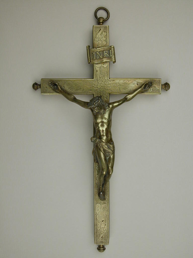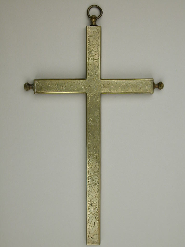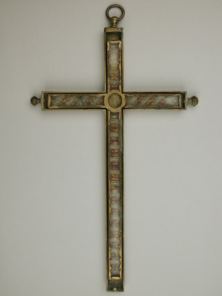 Reliekkruis met relieken van heiligen, met gegraveerde achtergrond met fruitbomen waaraan Christus met doornenkroon en lendedoek hangt