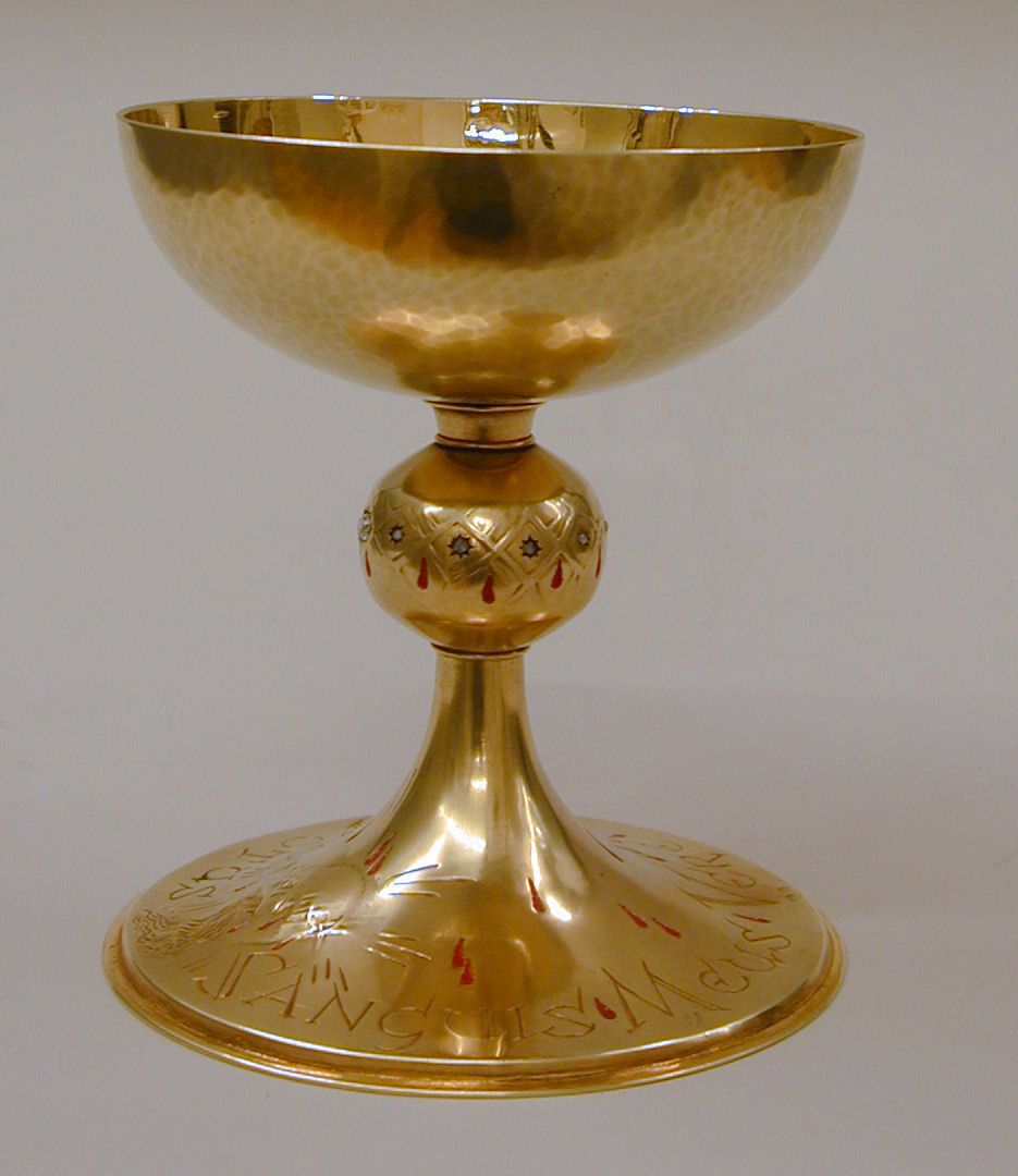 Miskelk met H. Hart met doornenkroon omringd door bloeddruppels, met "Sanguis meus ..."