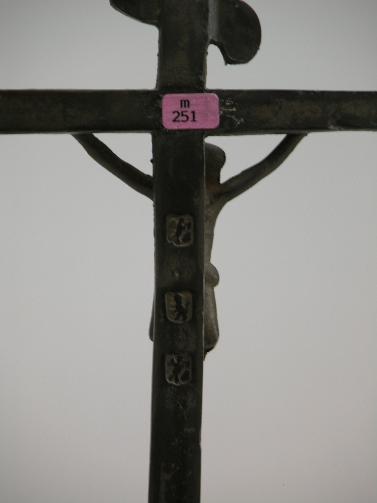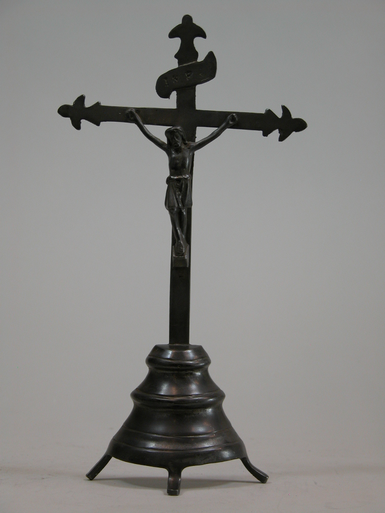 Schouwkruisje op halfronde voet met gekruisigde Christus met 'INRI'