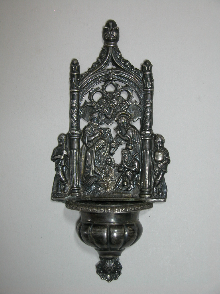 Wijwaterbakje met Jezus' geboorte in poort met "Gloria in excelsis Deo"