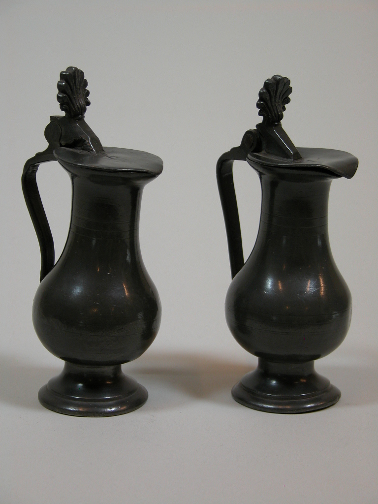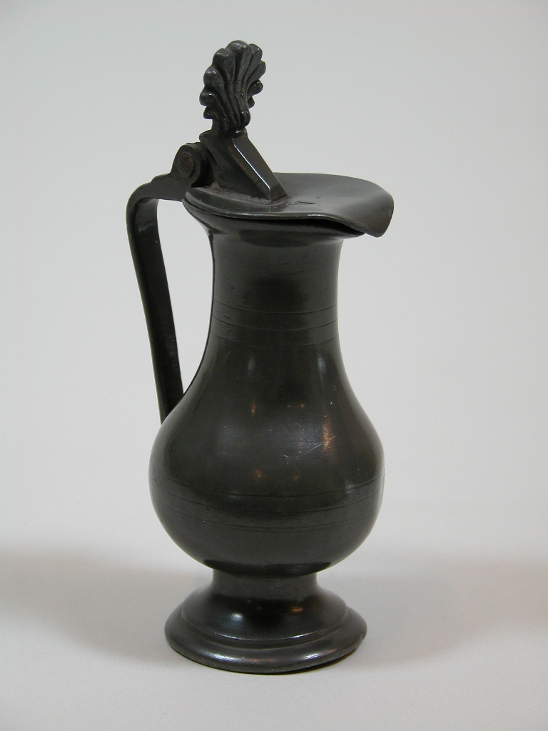 Tinnen ampul op voet met reliëfrand met drie dunne gegraveerde lijnen op hals en buik, met "A" op deksel