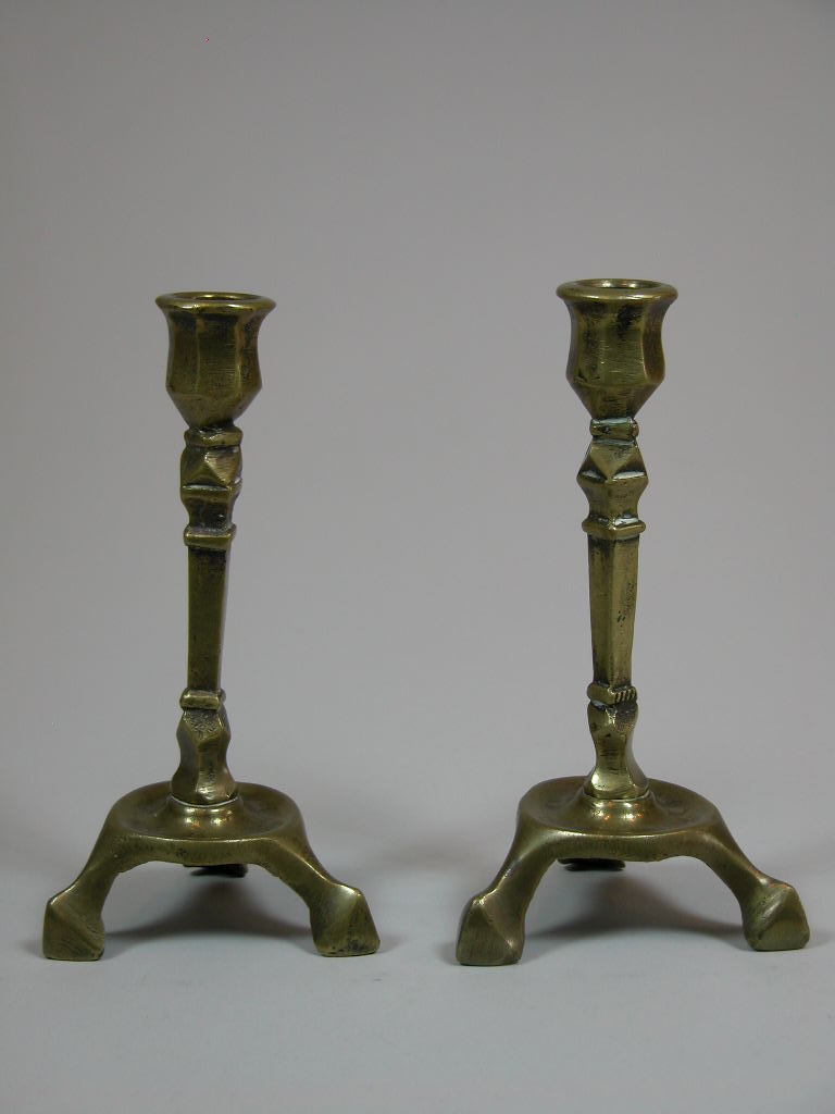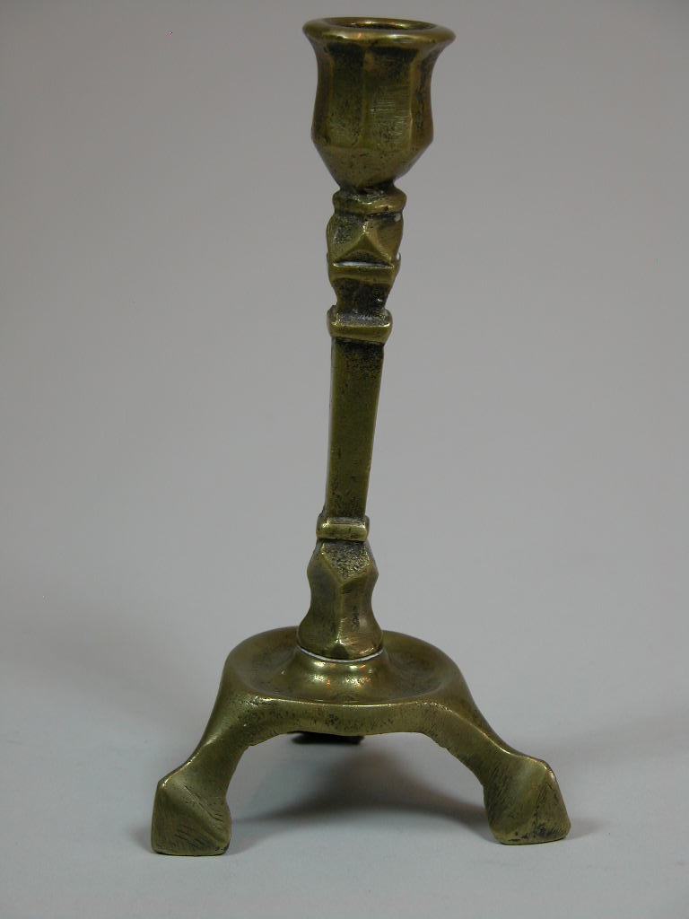 Smalle pijpkandelaar op gestileerde leeuwenpoten, met versierde hals en achthoekige kaarsenhouder