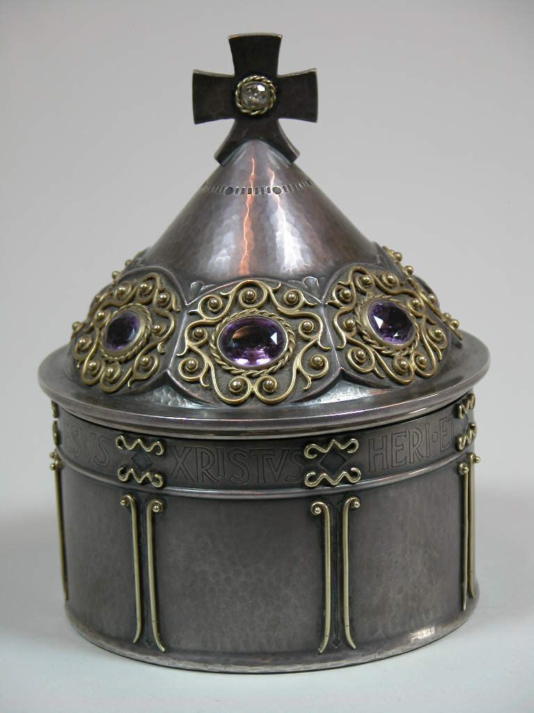 Pyxis met kruis op deksel, versierd met filigraanwerk en zeven amethisten, met "Iesus Christus heri et hodie ipse et in saecula"