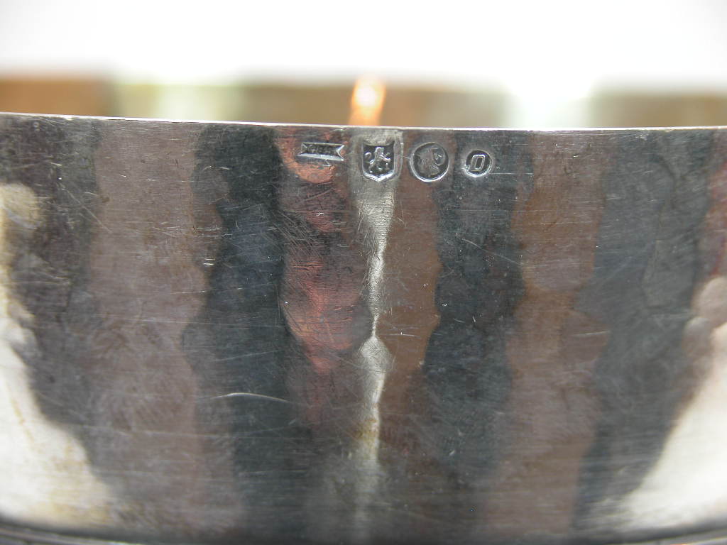 Merken (op cuppa): - C8S in liggende rechthoek met ingekeepte korte zijden (= meesterteken C.D. Sandifort, Amsterdam/Laren/Amsterdam/Rothem-Meerssen/Maastricht/Amsterdam/Sittard, 1929-1954) - klimmende leeuw met cijfer-1 (= zilver, eerste gehalteteken) - Minervakopje met letter-K (= keurkamerstempel '-s-Hertogenbosch) - letter-O (= jaarletter 1949) Onderzijde voet: - COR, met daaronder letter-S in driehoek (met de punt omlaag)
