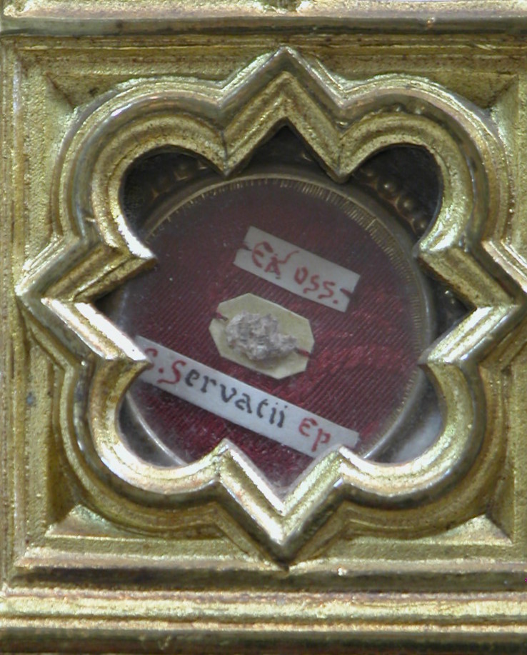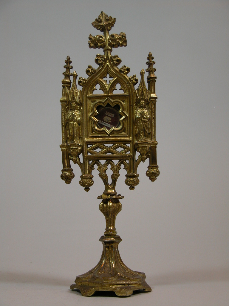 Reliekostensorium van koper, neogotisch met bladversiering aan de randen, in het midden theca met reliek ex oss. H. Servatius van Maastricht geflankeerd door twee engelen