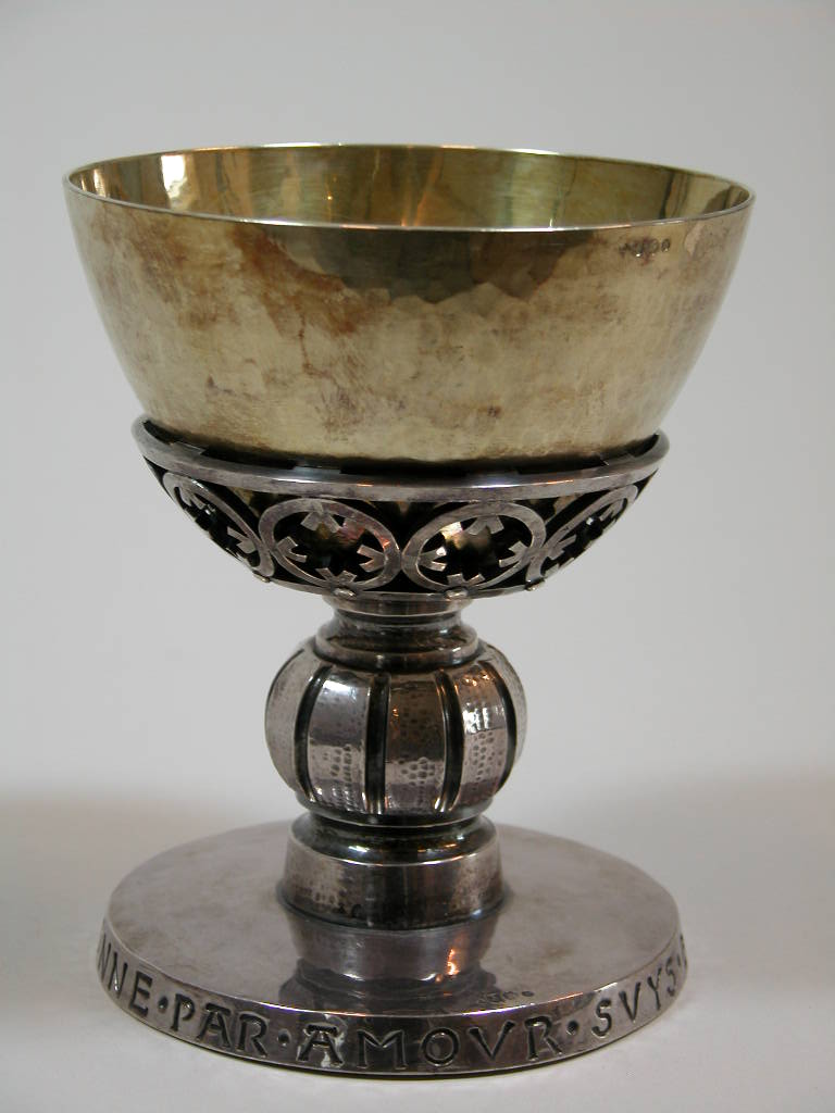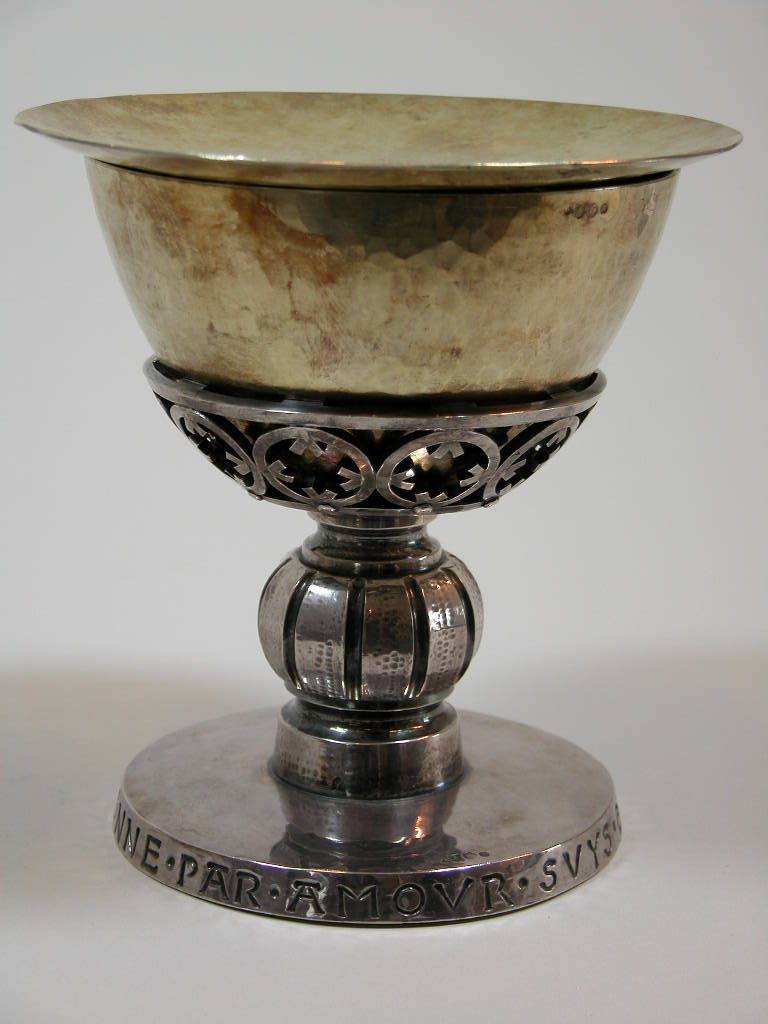 Kelk met 'Suis donne par amour' (twee maal) op voet met tegencuppa en goudkleurige cuppa