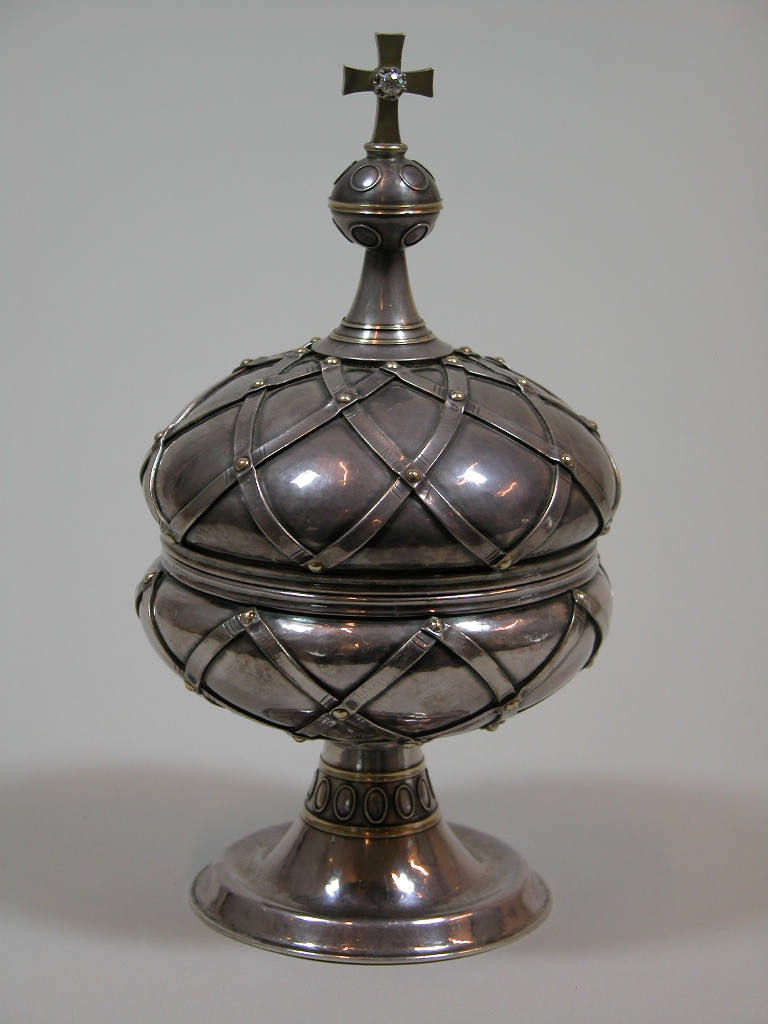 Ciborie op ronde voet met metaalbeslag en kruisje met twee diamanten op deksel