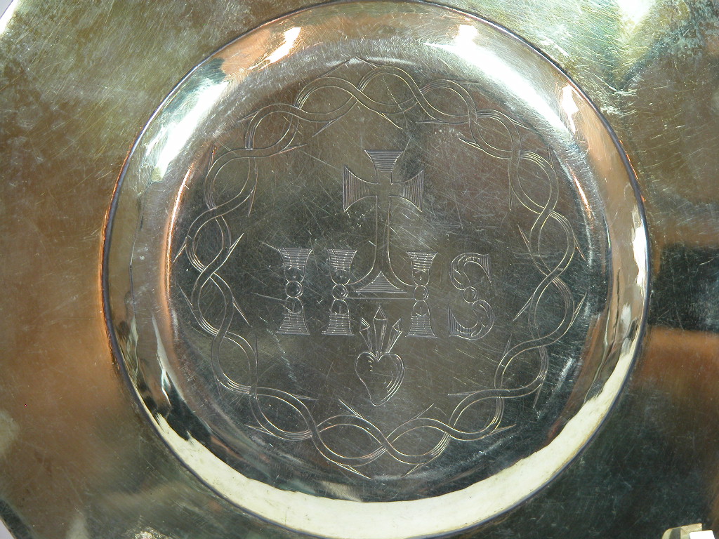 Pateen met opstaande rand met op achterkant IHS met doorboord hart, omringd door doornenkroon