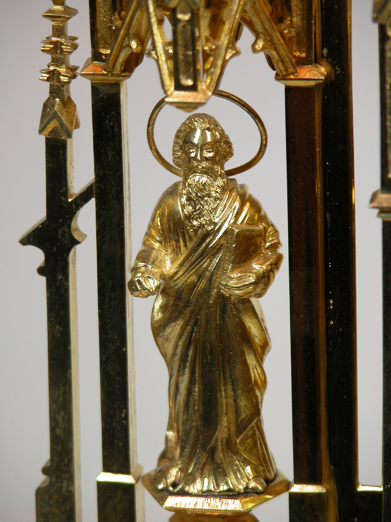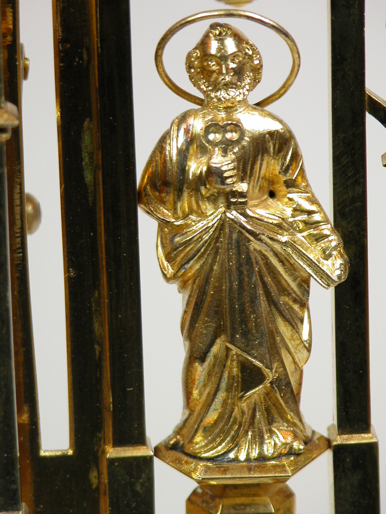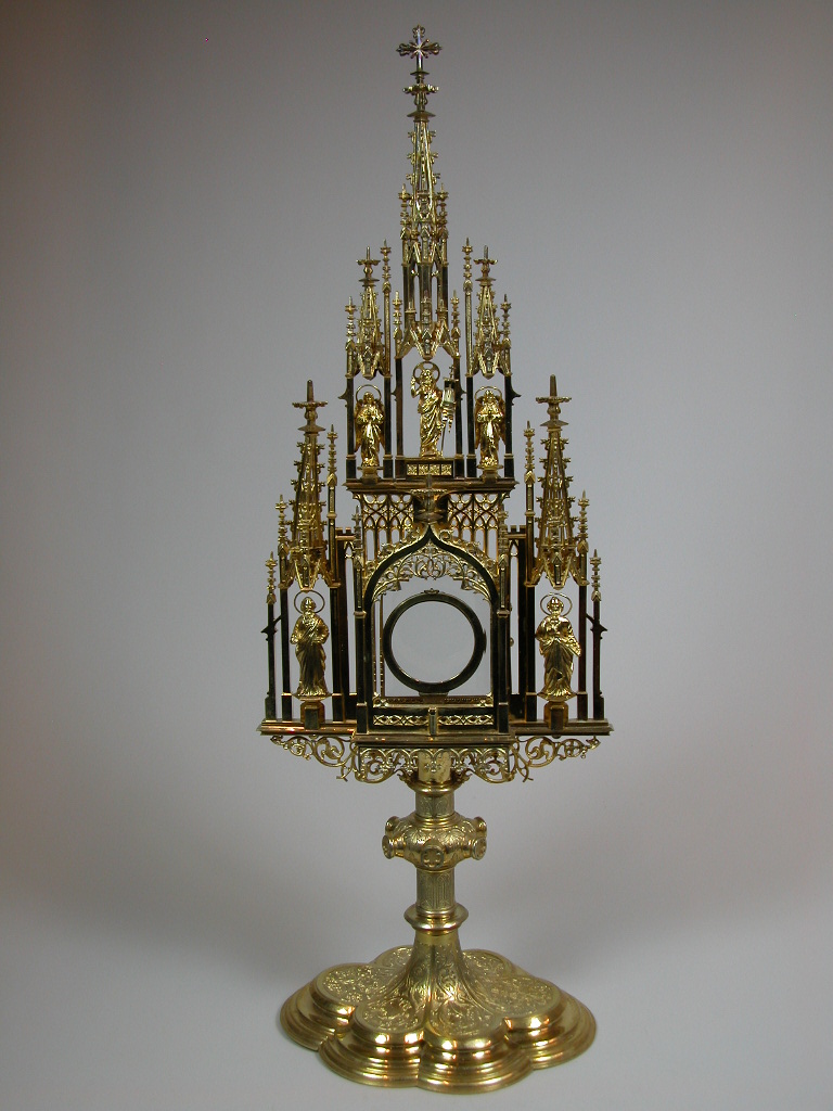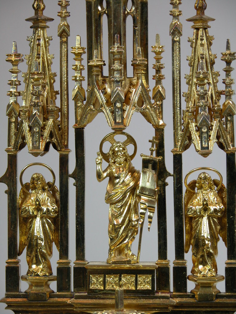 Monstrans op zeslobbige voet met Petrus en Paulus en Christus met kruisvaan geflankeerd door twee engelen