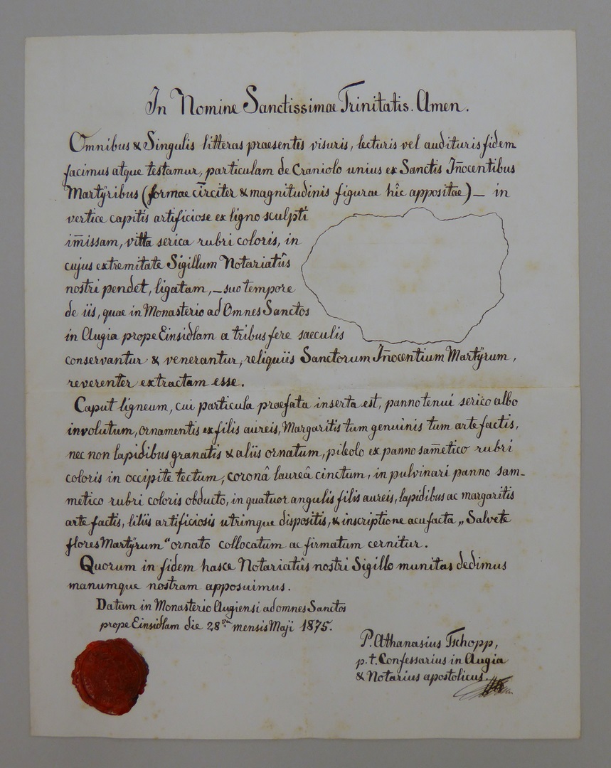 Echtheidsverklaring bij relieken van Onschuldige Kinderen met "In Nomine Sanctissimae Trinitatis .."