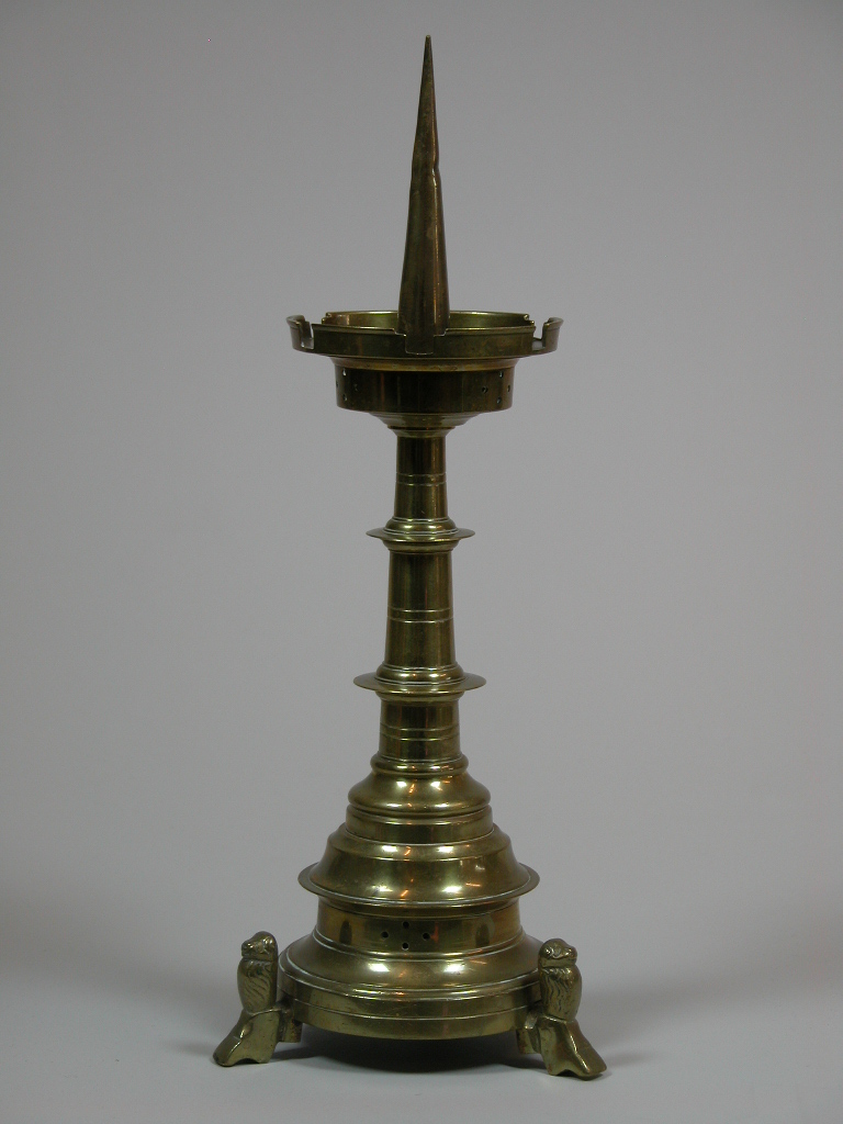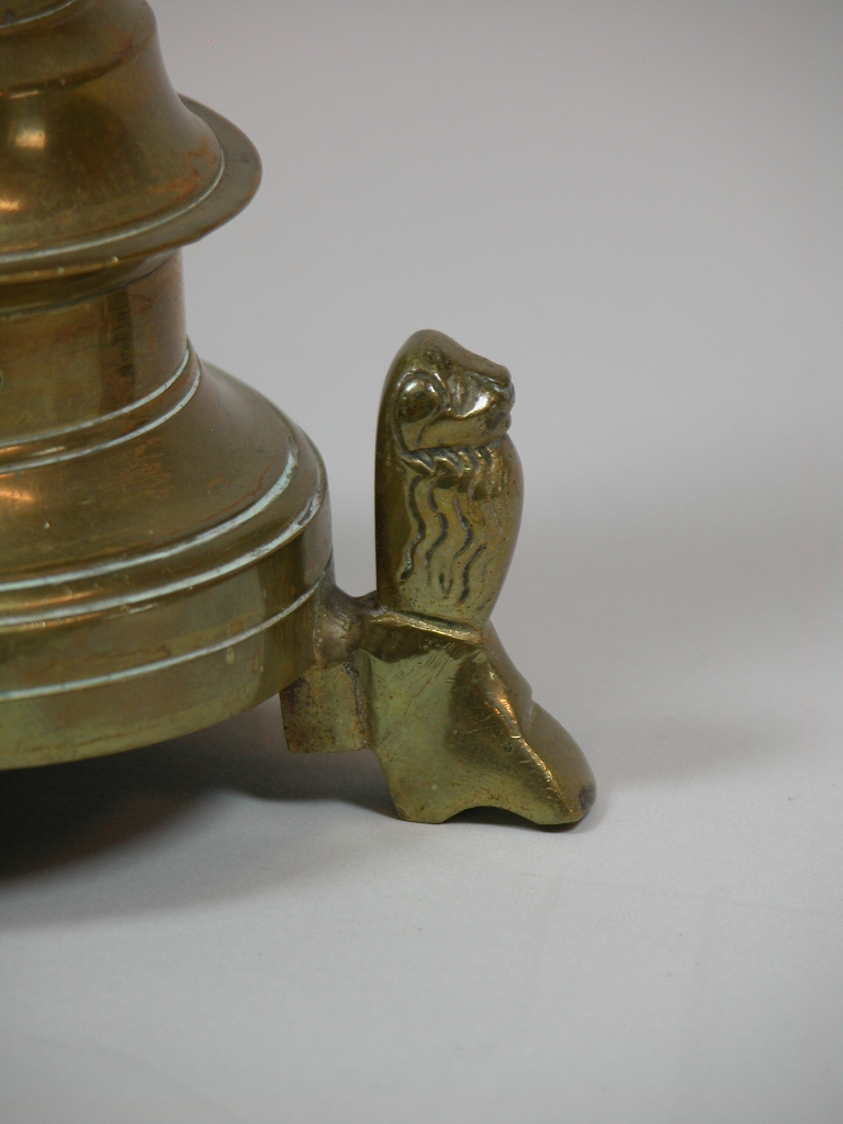 Altaarkandelaar op ronde voet met drie pootjes in de vorm van een leeuw