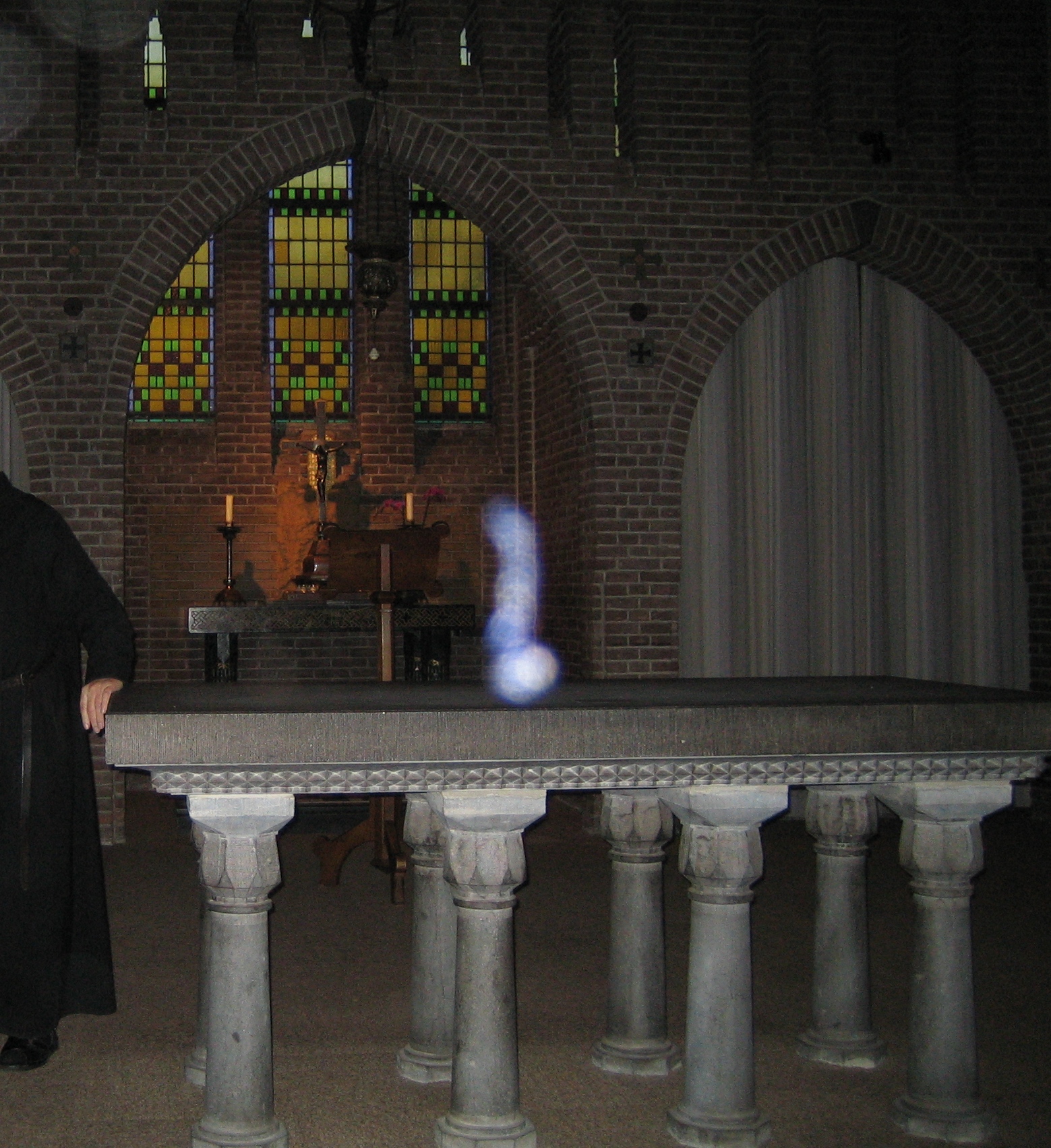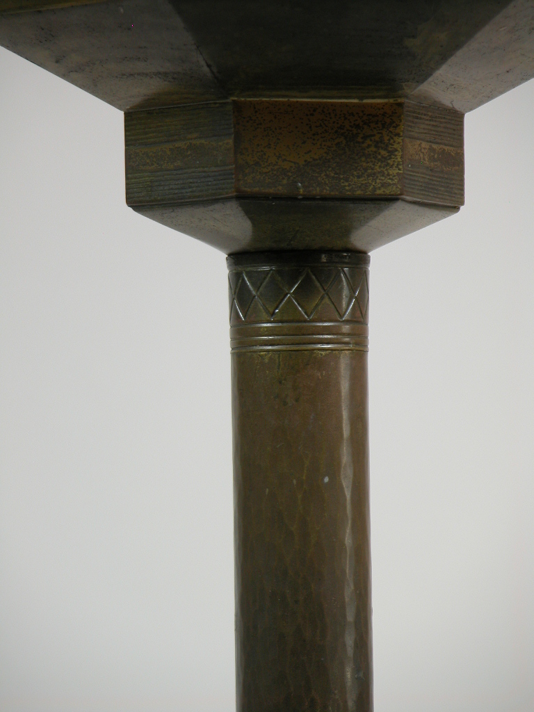 Altaarkandelaar met zeshoekige koepelvormige voet op pootjes met zeshoekig schaaltje en daarop vetvanger