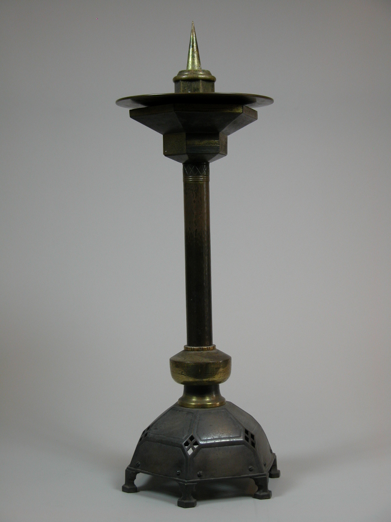 Altaarkandelaar met zeshoekige koepelvormige voet op pootjes met zeshoekig schaaltje en daarop vetvanger