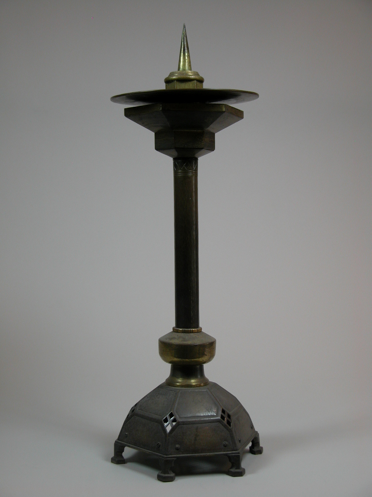 Altaarkandelaar met zeshoekige koepelvormige voet op pootjes met zeshoekig schaaltje en daarop vetvanger
