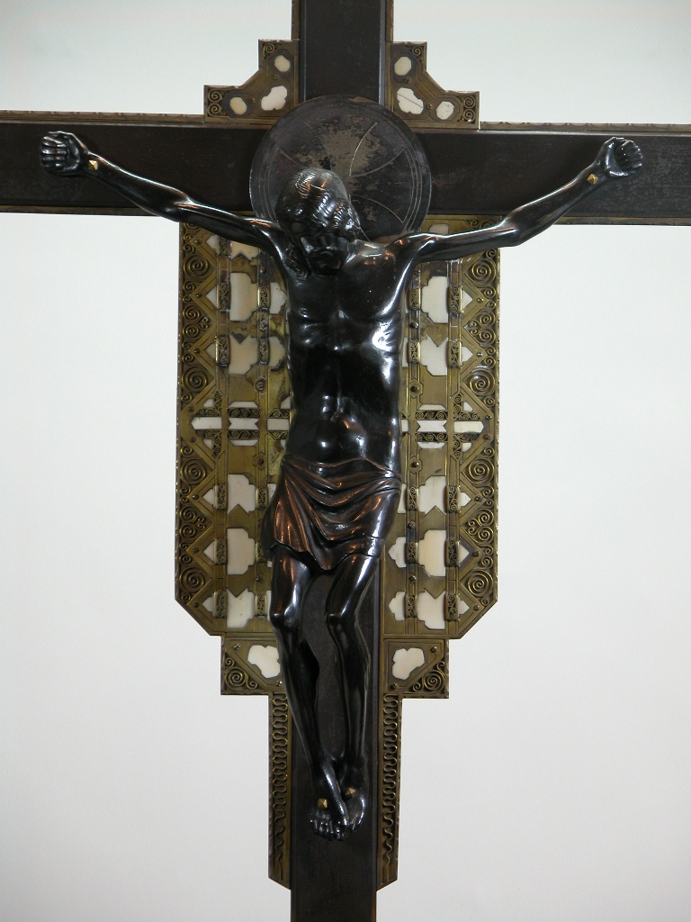 Christus aan het kruis op zeskantige voet, met filigraanwerk en ingelegd ivoor rond hart van kruis, staand op vierkante voet StCC m305b