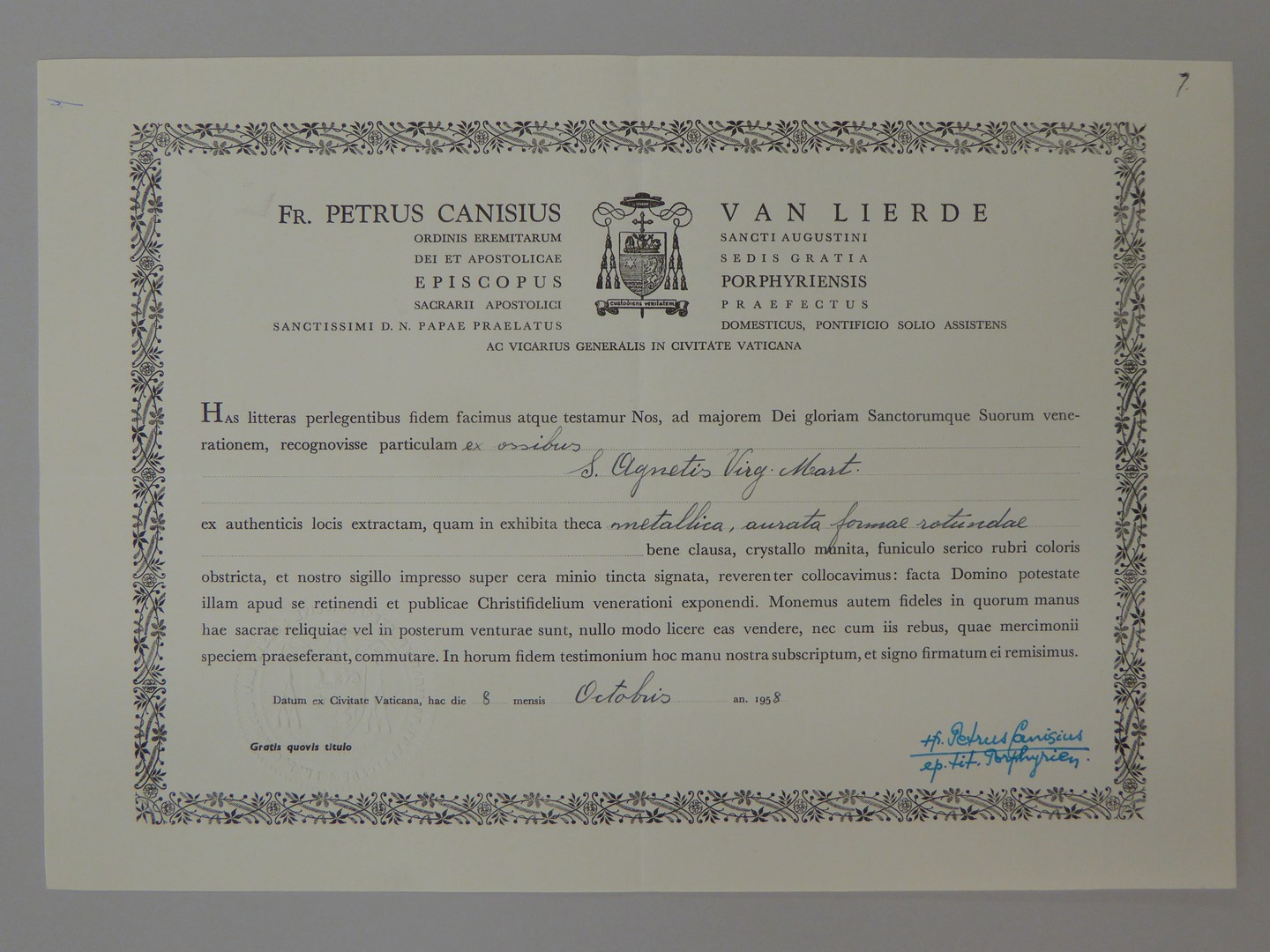 Echtheidsverklaring bij reliek van H. Agnes met "Fr. Petrus Canisius van Lierde ..."