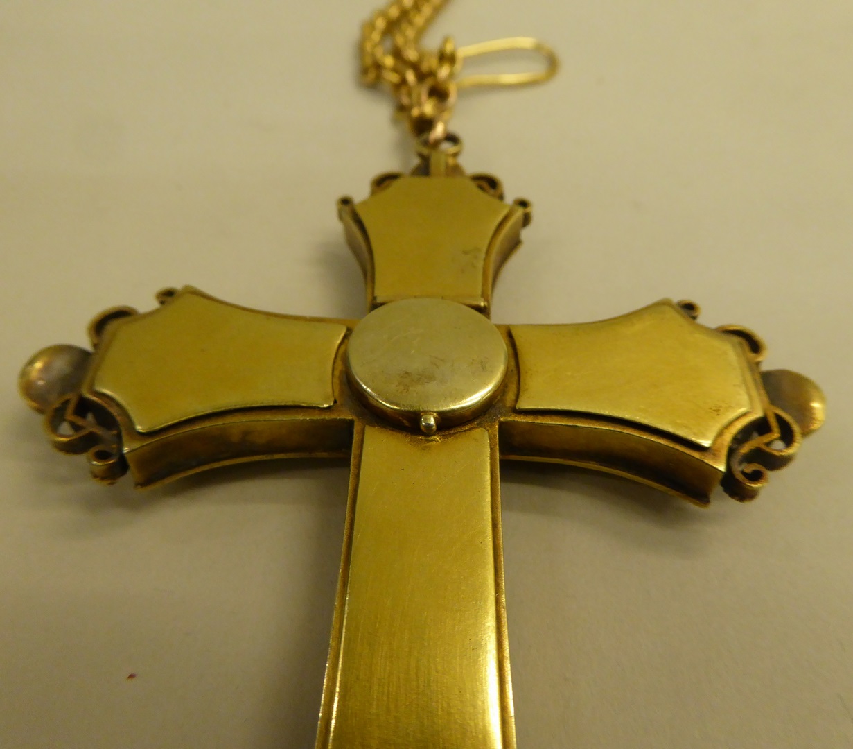 Borstkruis van kardinaal Willem Marinus van Rossum (1854-1932). Verguld zilveren kruis met gouden(?) ketting. Kruis met zich verbredende kruisarmen met inzwenkende hoeken en een schelpmotief en voluten aan de uiteinden. Het kruis is bezet met twaalf rechthoekige amethisten en vier ronde witte stenen. Aan achterzijde centraal opklapbaar rond deksel met kruisreliek. In de kruisarmen verder ...