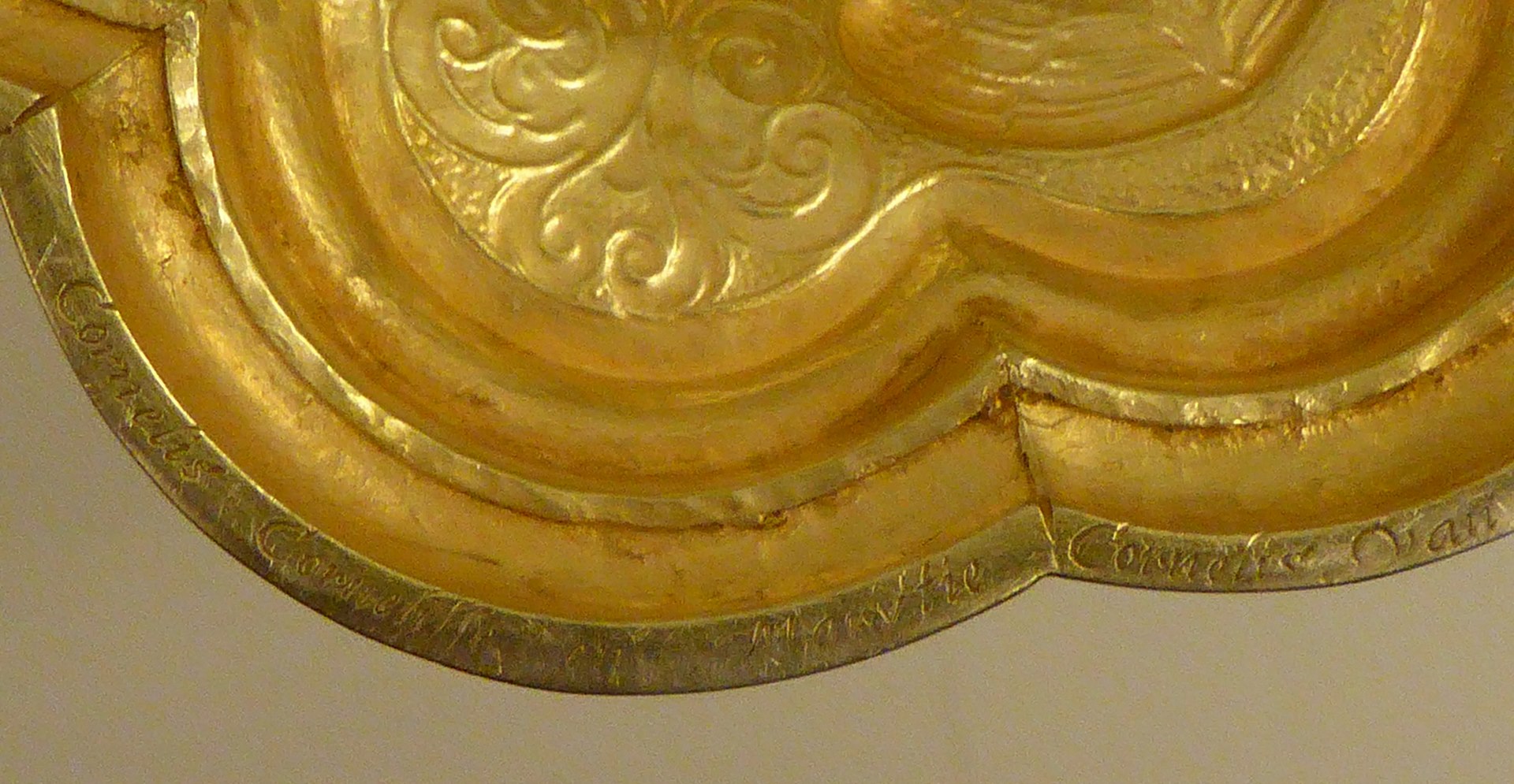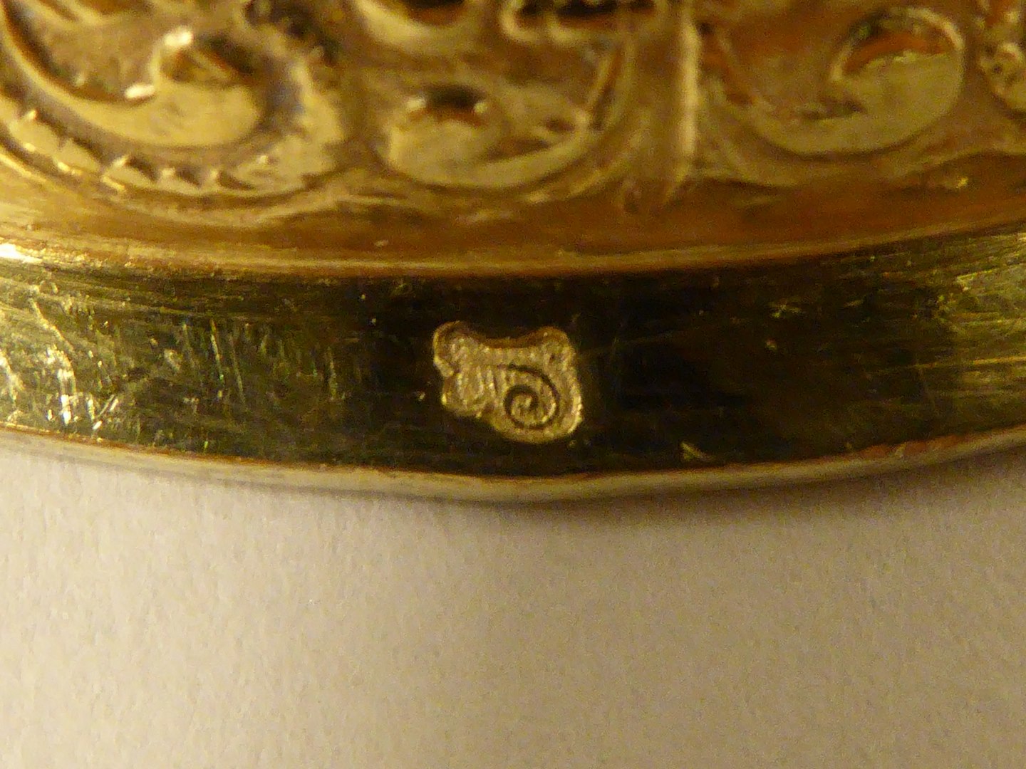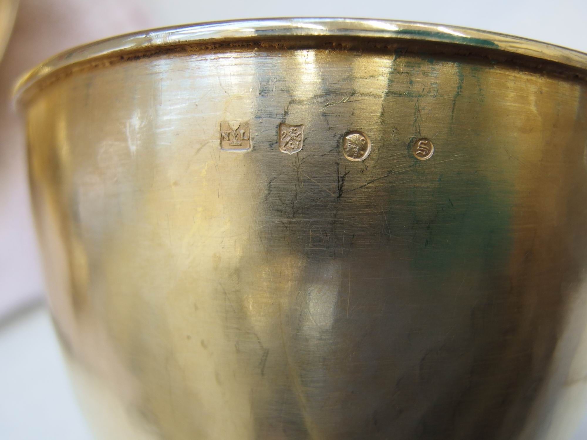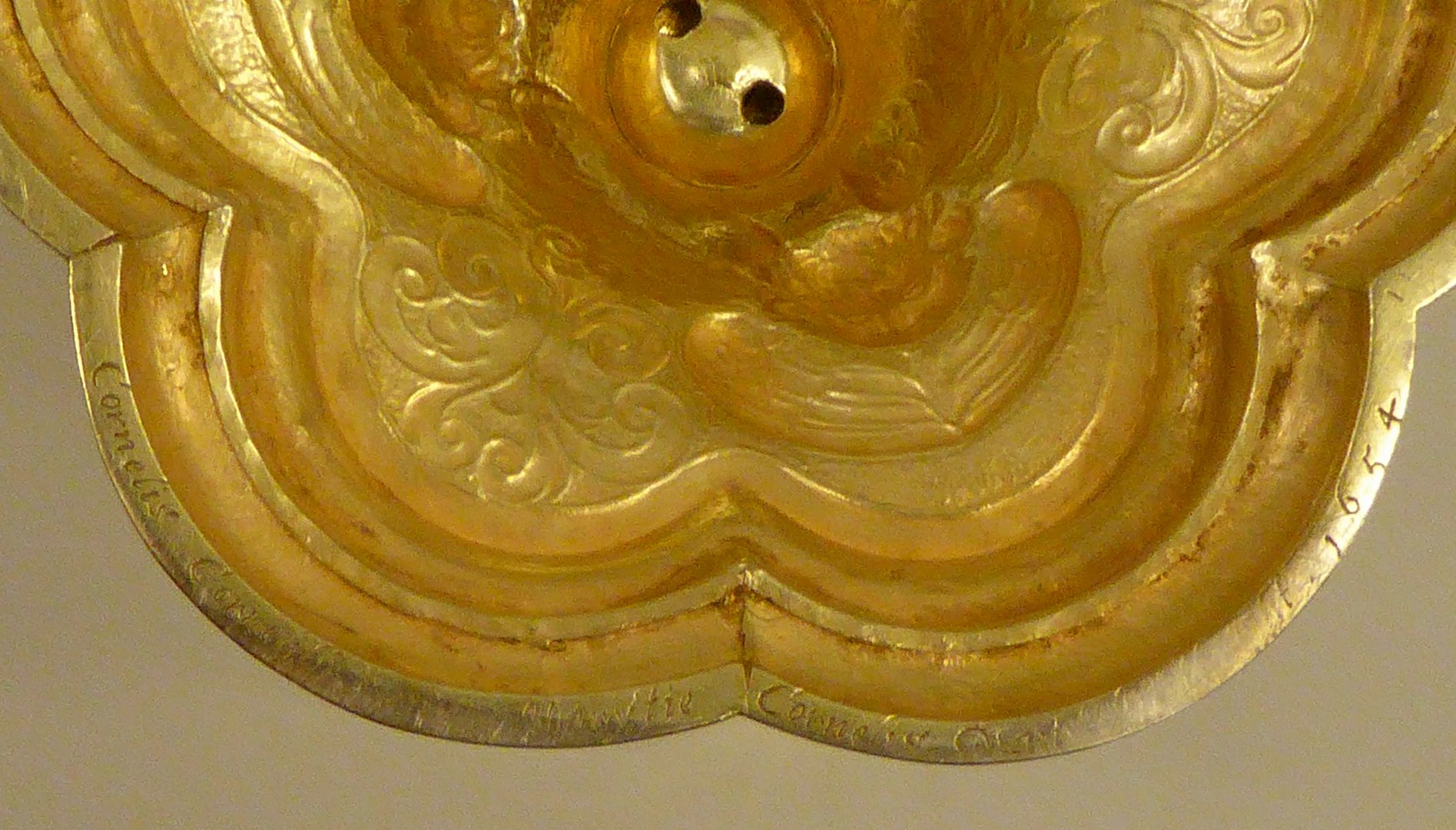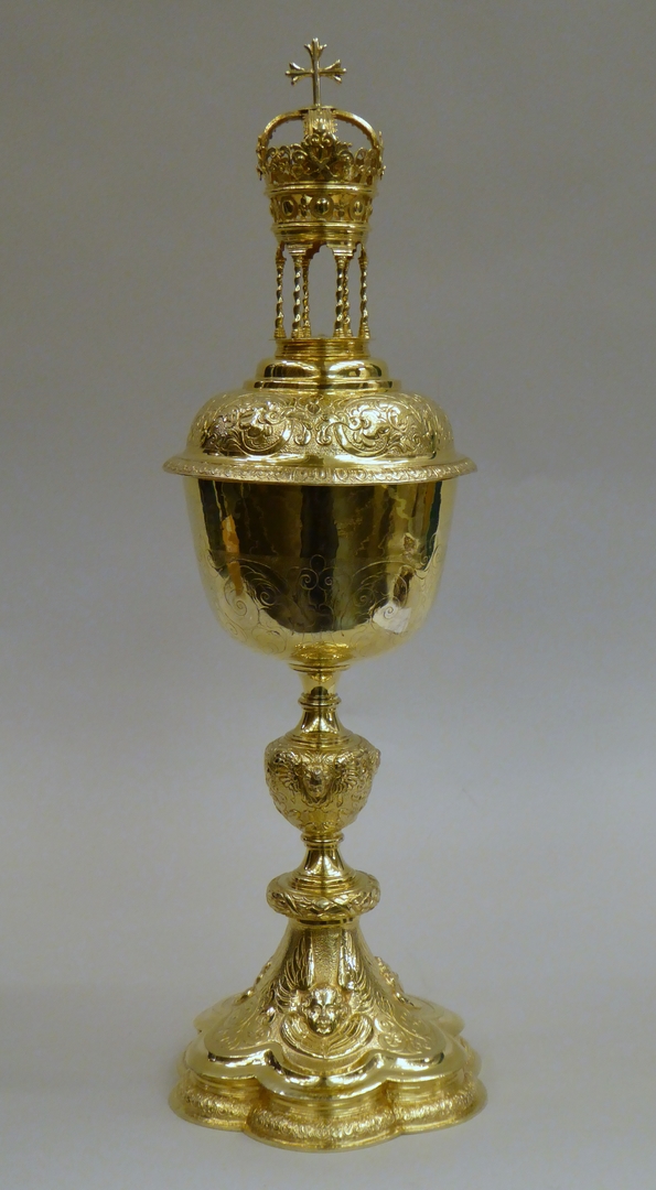 Ciborie van verguld zilver, op zeslobbige voet met geornamenteerde rand en filetrand. Op de welving driemaal een engelenkopje en driemaal een voluutornament. Aan de onderzijde van de stam een ring met lauwerkrans. Peervormige nodus met drie engelenkopjes tussen acanthusblad en voluten. Tegencuppa van gevoluteerd rankwerk. Deksel met overkragende godronrand en op welving rankwerk met bloemen. ...