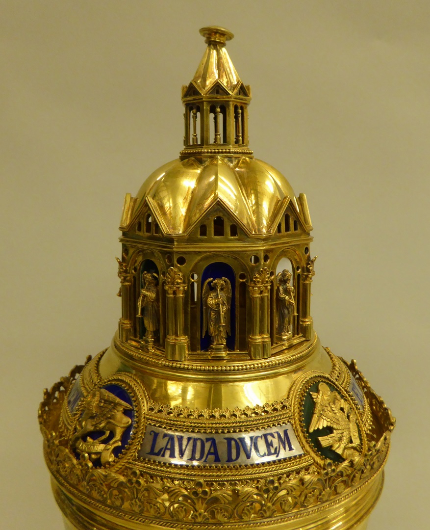 Ciborie op vierlobbige voet waarop vier medaillons met Christusbuste, deksel waarop medaillons met evangelistensymbolen en met koepel met rondboognissen en engelen