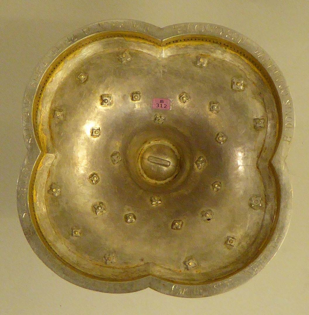Ciborie van verguld zilver op vierlobbige voet met tekst: "NON PRO EIS AVTEM ROGO TANTVM,SED ET / PRO EIS, QVI CREDITVRI SVNT PER VERBVM / EORVM IN ME, VT OMNES VNVM SINT / SICVT TV PATER IN ME, ET EGO IN TE +". Op de welving vier medaillons met Christusbuste: 1) Chr. Salvator, met rijksappel ...