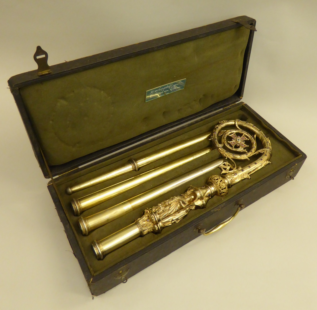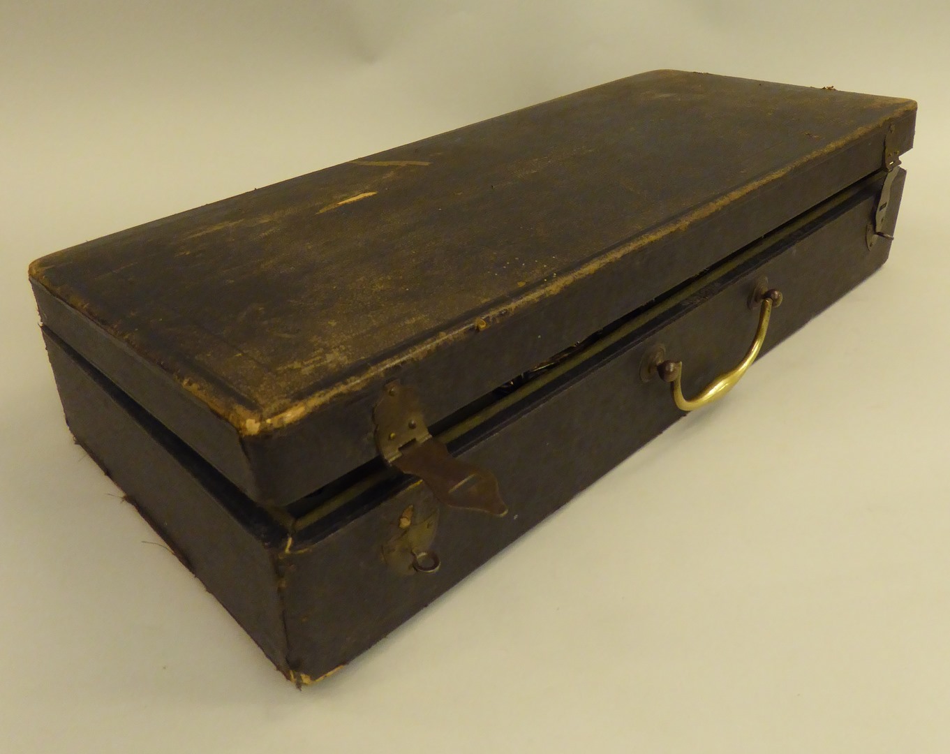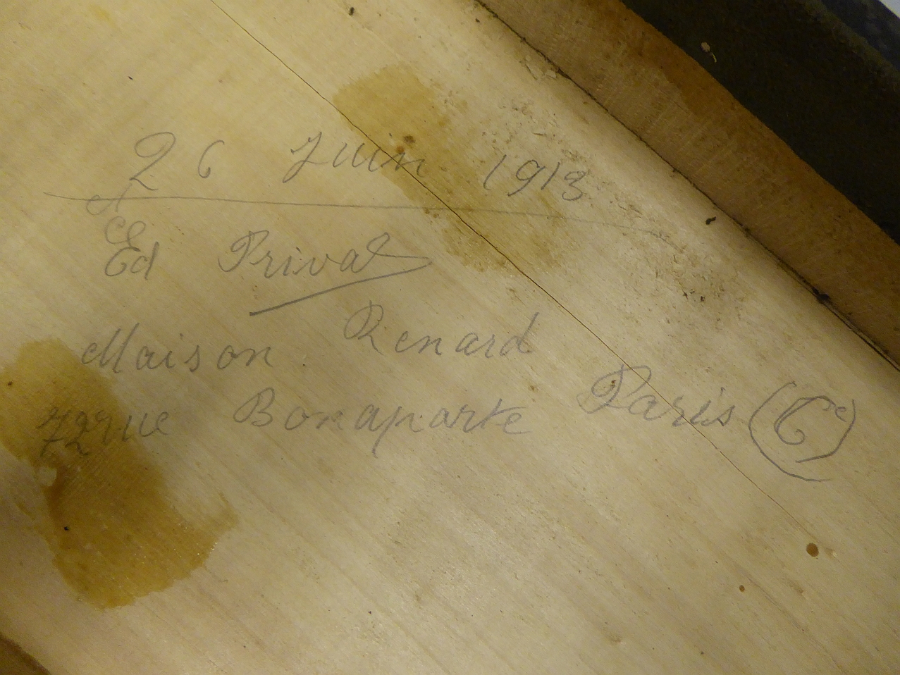 Zwarte foedraal voor StCC m315a. Op de binnenrand bij het handvat is een deel van een in goud gedrukte tekst nog leesbaar: ... 3 rue cassette / Paris. Aan de binnenkant is op de bodem van de kist met potlood het volgende geschreven: 26 juin 1913 / Ed Privas / Maison Renard / 72 rue ...