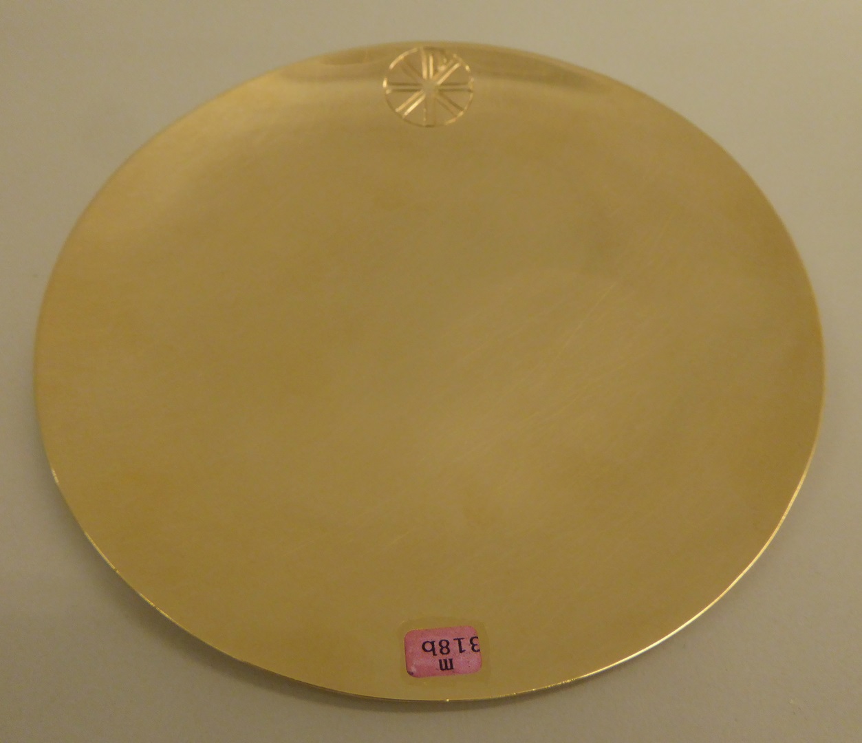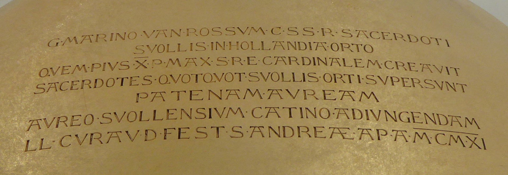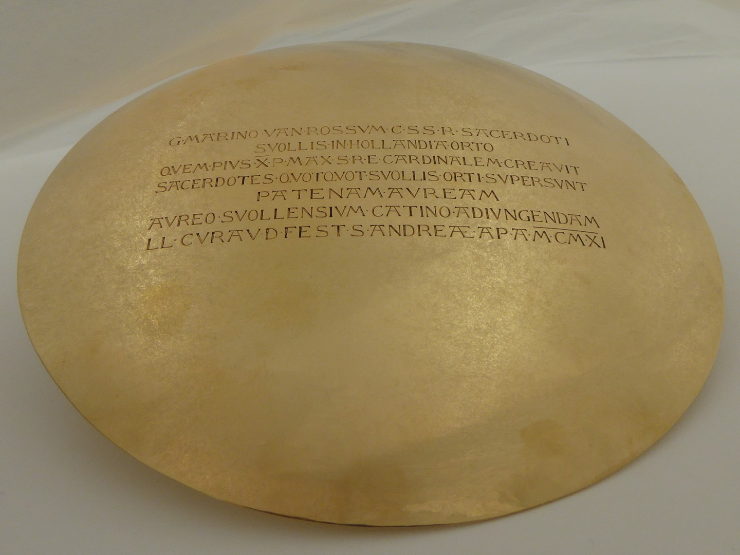 Pateen met XP-monogram in cirkel, op onderzijde met "G. Marino van Rossum CssR sacerdoti svollis in Hollandia orto quem Pius X P. Max. S. Re cardinalem creavit sacerdotes quot Svollis orti supersunt patenam auream aureo svollensium catino adiungendam LL cura [m?] d. fest. S. Andreae ap. A. MCMXI". Merken: - eikenblad (= vierde gehalteteken goud, ...