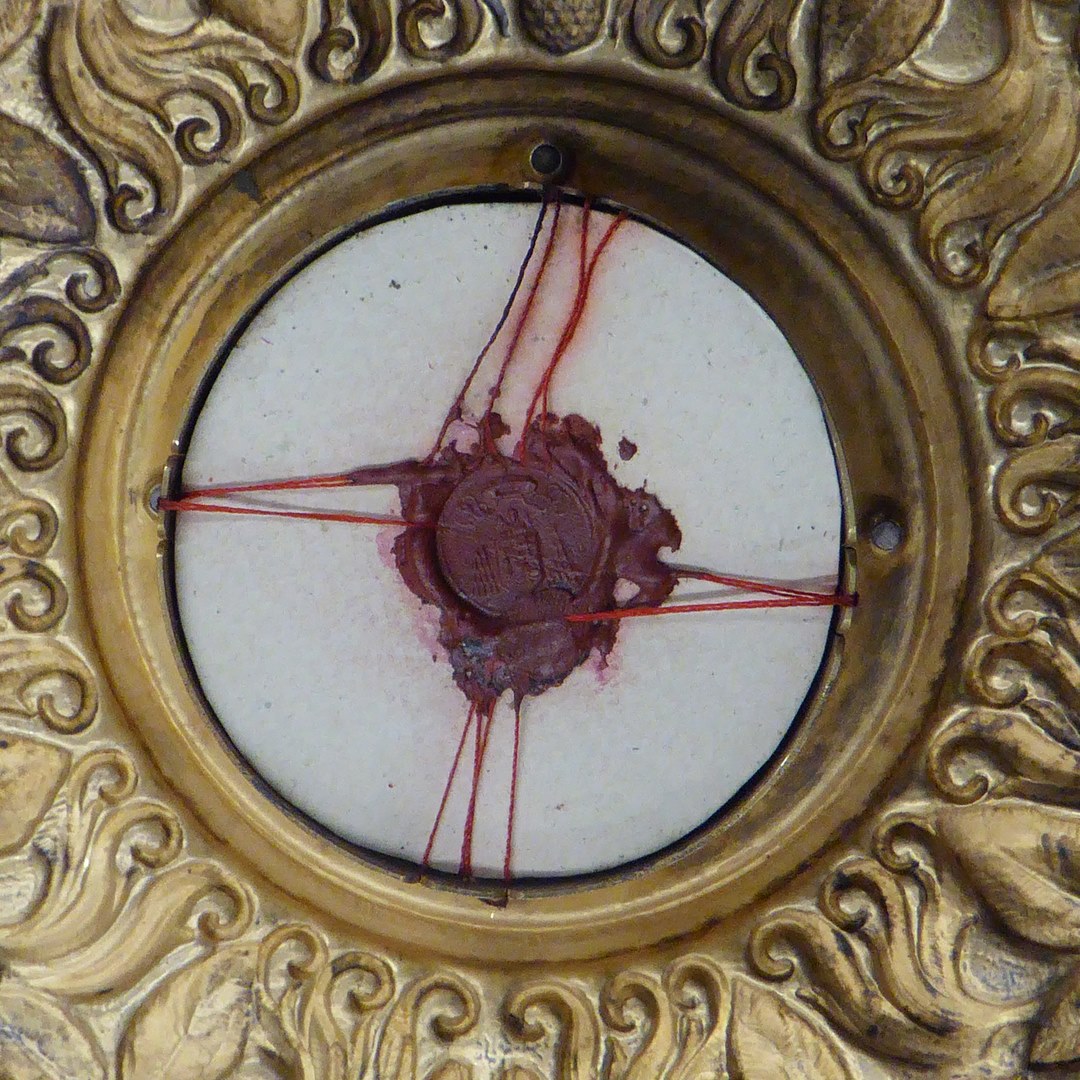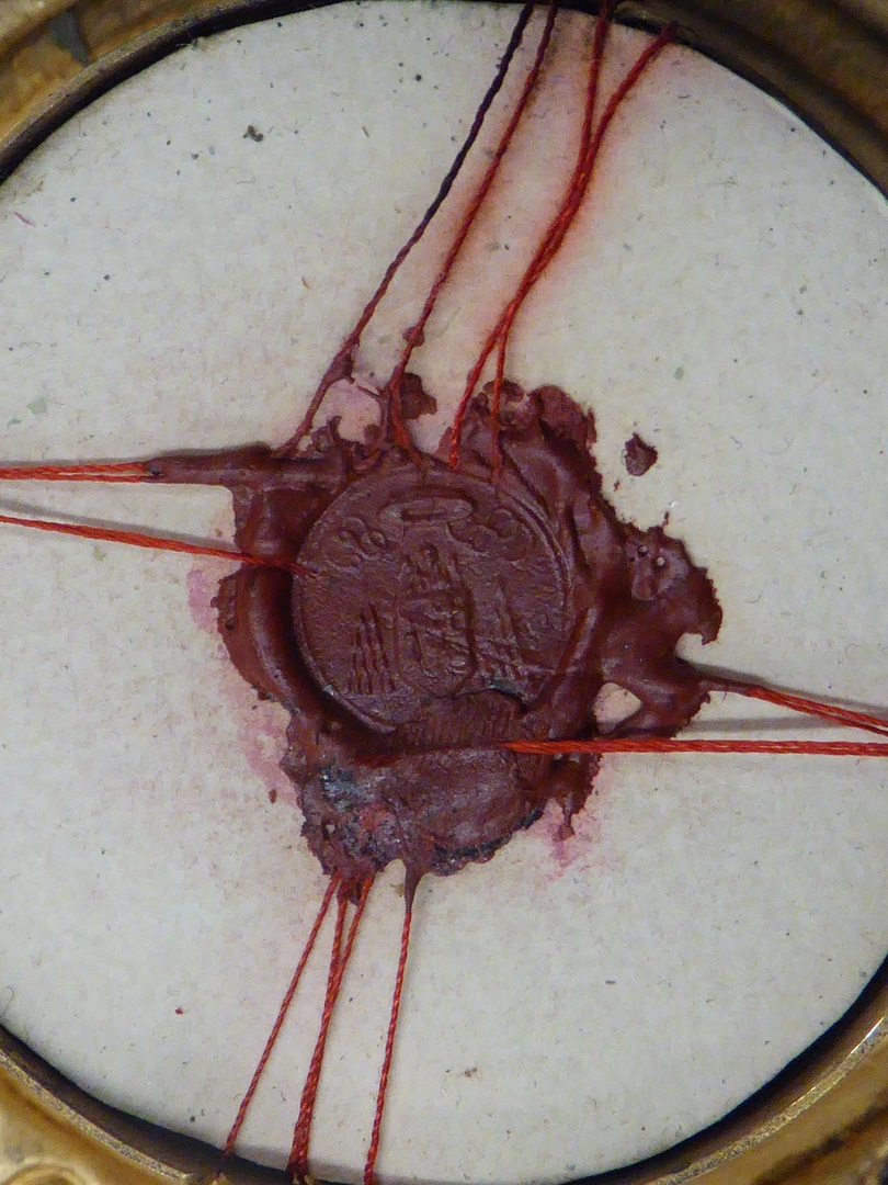 Reliekhouder in vorm van frambozentakken(?) met reliek van Alphonus de Liguori en met "S. Alf. M. Xi amore animarum zelo succense o.p.n."