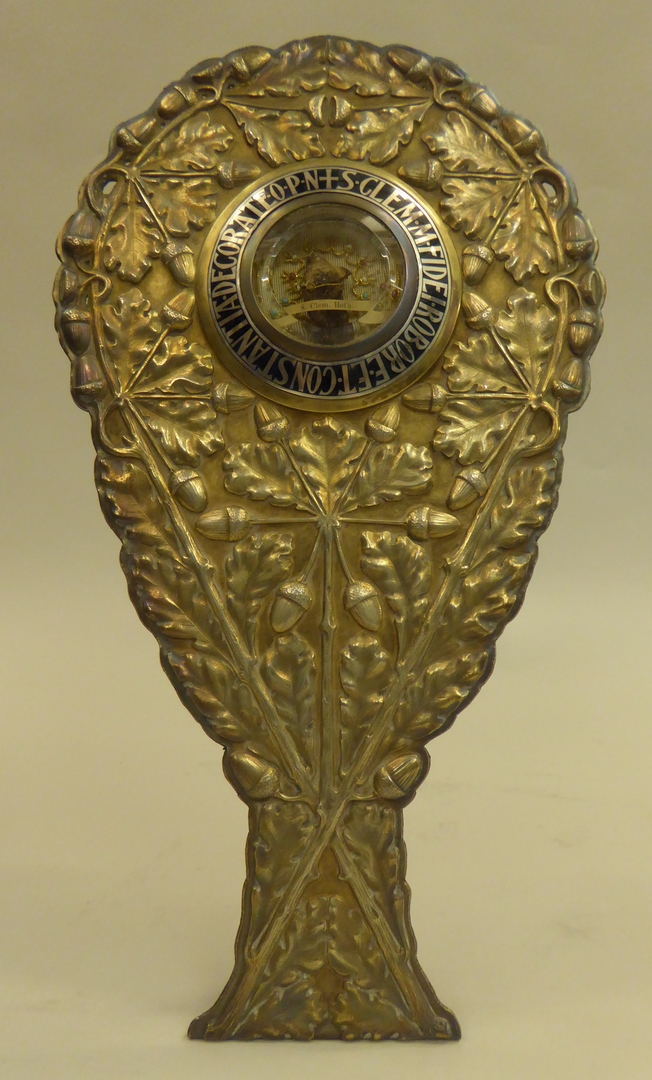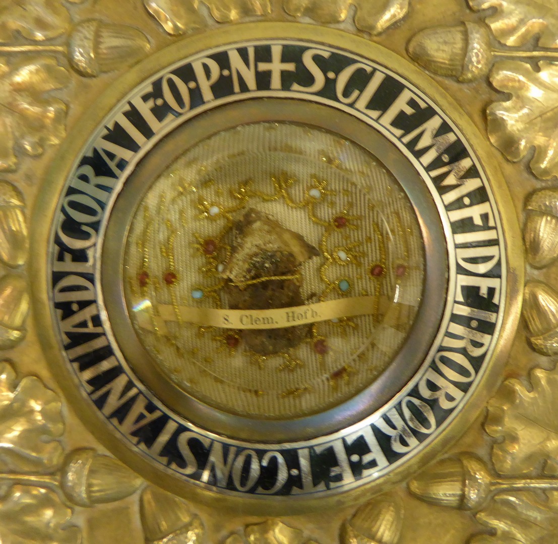 Reliekhouder in vorm van twee gekruiste eikentakken met reliek van Clemens M. Hofbauer en met "S. Clem. M. fidei robore et constantia decorate o.p.n."