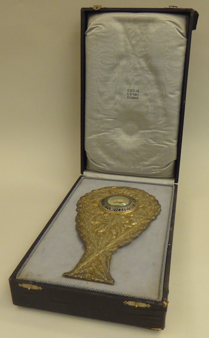 Reliekhouder in vorm van twee gekruiste eikentakken met reliek van Clemens M. Hofbauer en met "S. Clem. M. fidei robore et constantia decorate o.p.n." Achter het reliek een reliekbrief verzegeld met het lakzegel van W.M. kardinaal van Rossum. Merken (deksel achterzijde theca): - K2 in liggende rechthoek (= essaieursteken H.F.J. Kaub) - Romeins zwaardje (= ...