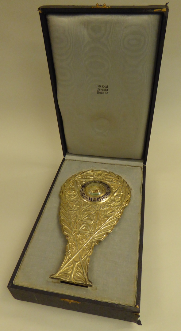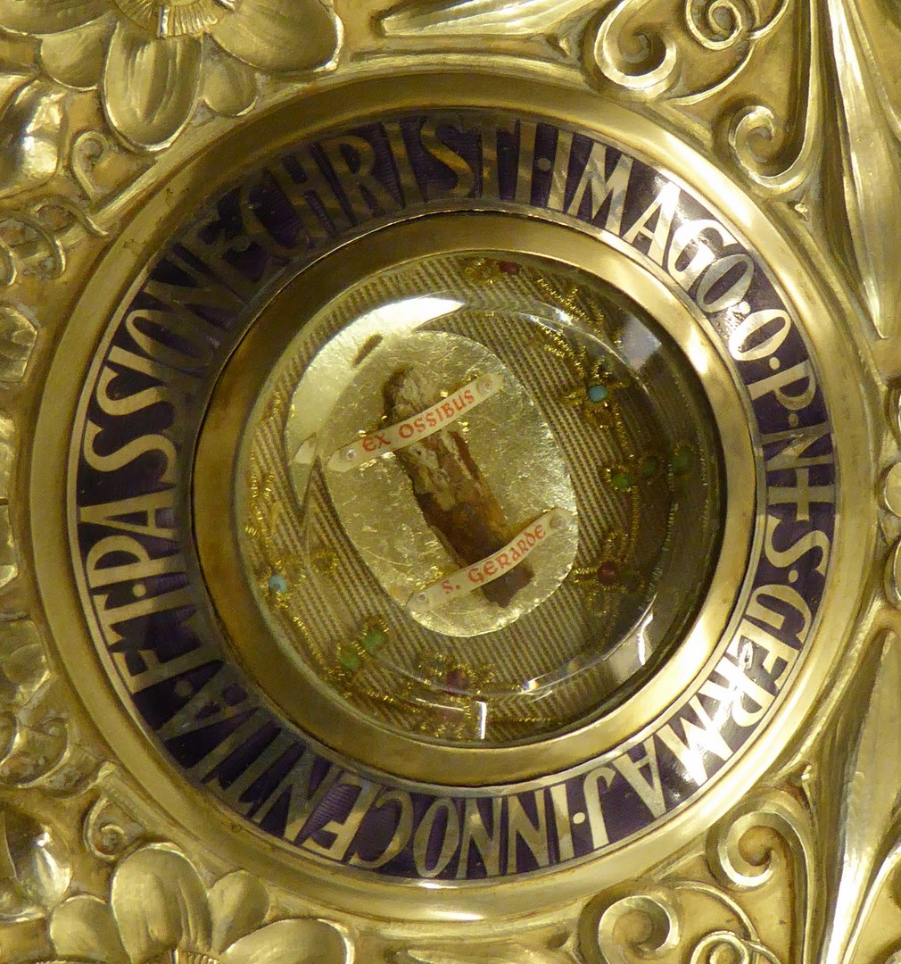 Reliekhouder in vorm van twee gekruiste lelie- en bloemtakken met reliek van Gerardus Majella en met "S. Ger. Maj. Innocentia et passione Christi imago o.p.n." Achter het reliek een reliekbrief verzegeld met het lakzegel van de Nederlandse Provincie der Redemptoristen. Merken (op voetsteun): - monogram B met hamertje, in staande rechthoek (= meesterteken J.G.J.E. & ...