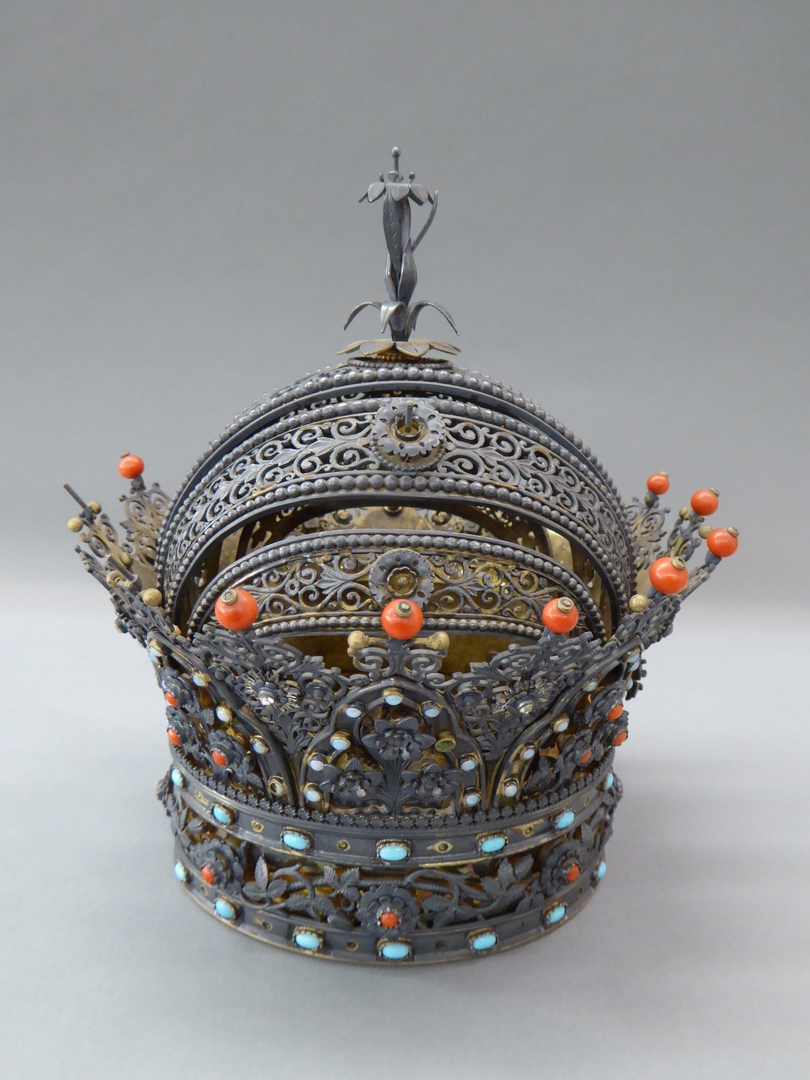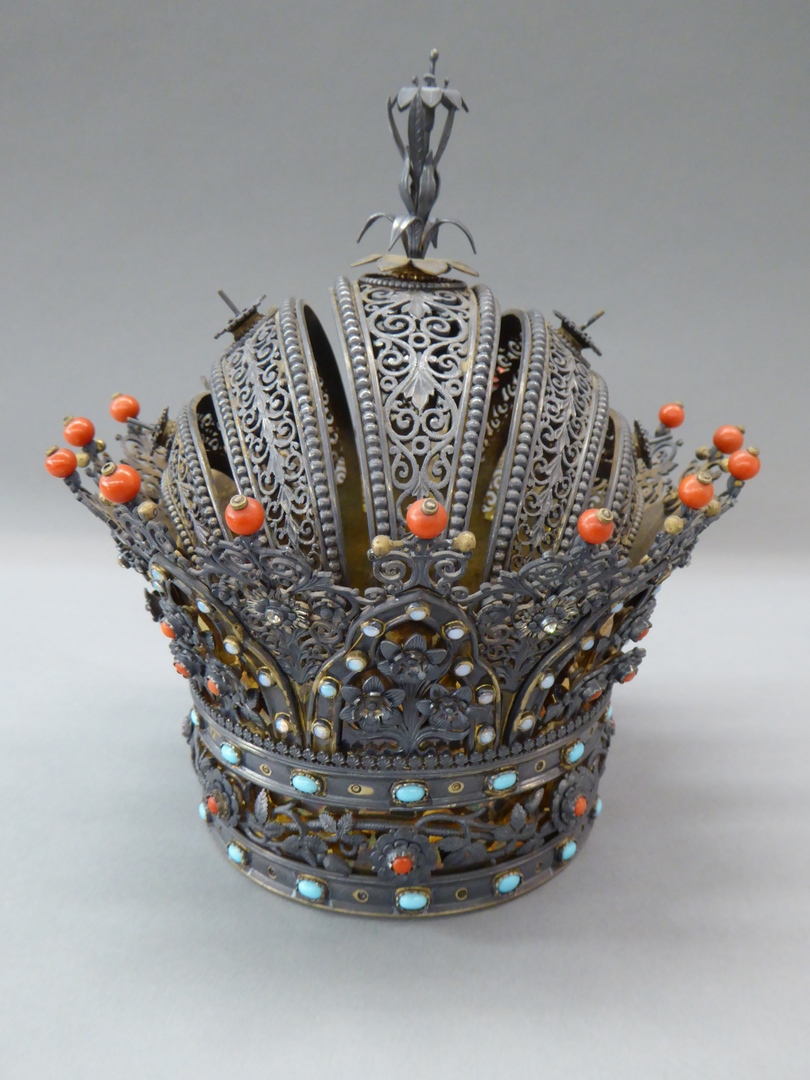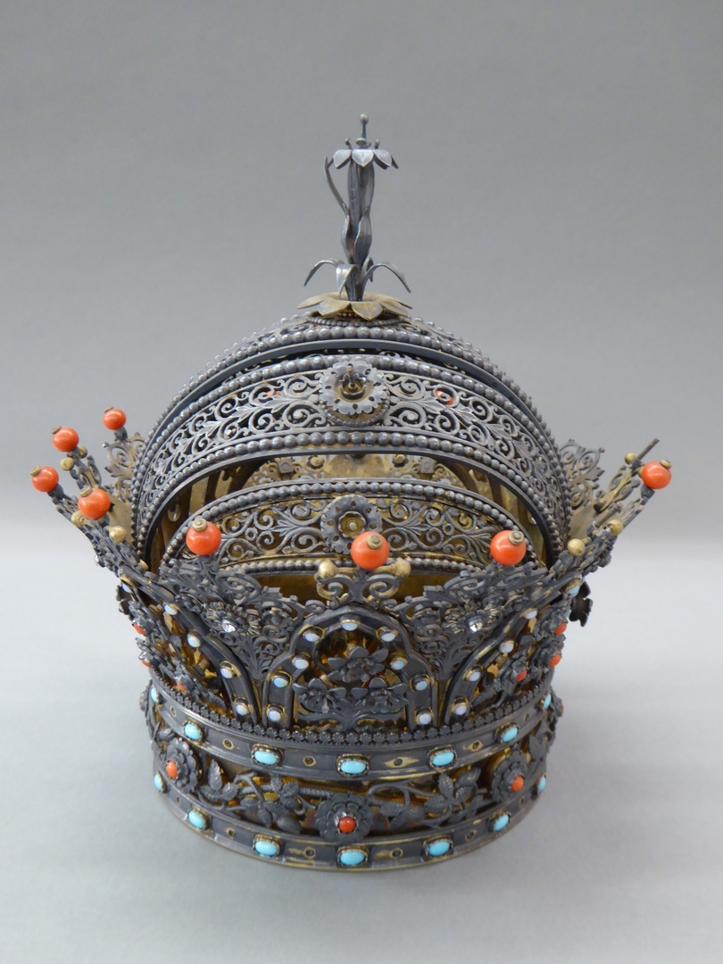 Attribuut voor Mariabeeld: Kroon in ajour waarvan onderrand bestaat uit twee banden bezet met glassteentjes (opaalimitaties?), waartussen opengewerkte band met rozentakken, het hart van de bloemen bezet met een bloedkoraal. Hierboven iets uitkragende driepasbogen, alternerend gevuld met rozen en lelies. Tussen de bogen ajour bladwerk telkens getopt door een bloedkoraal. Bovendeel bestaat uit vijf beugels ...