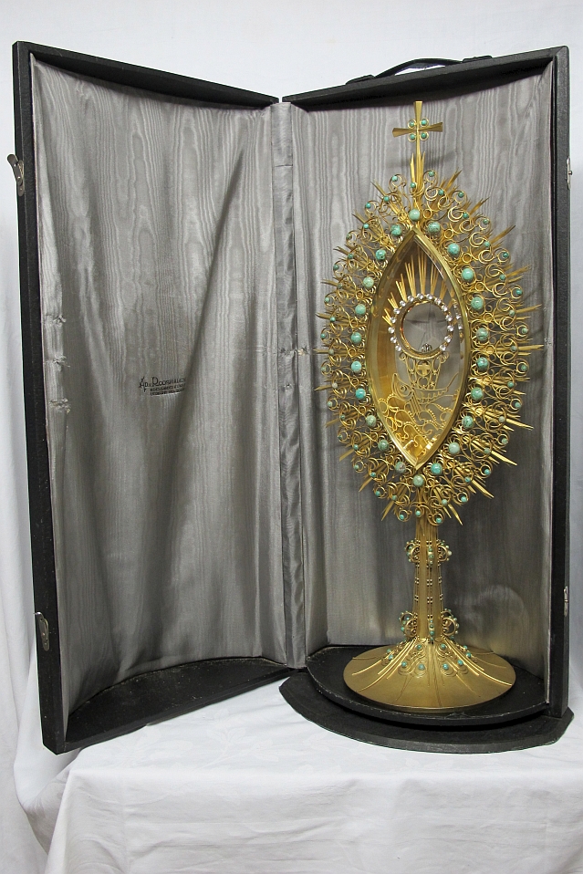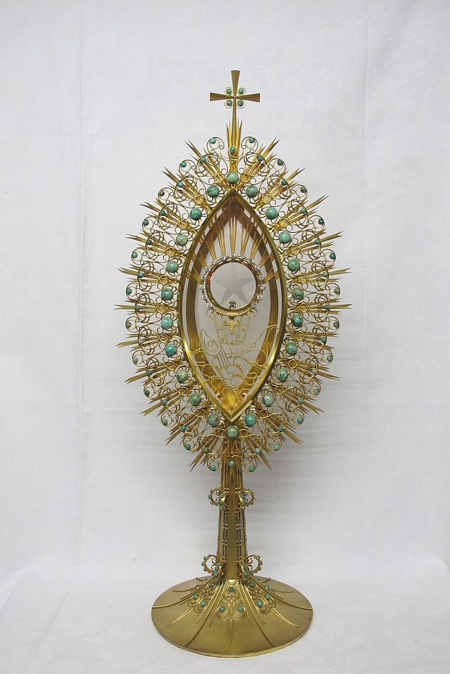Monstrans op ronde voet met amandelvormige hostiekast met groene stenen, bekroond met kruis