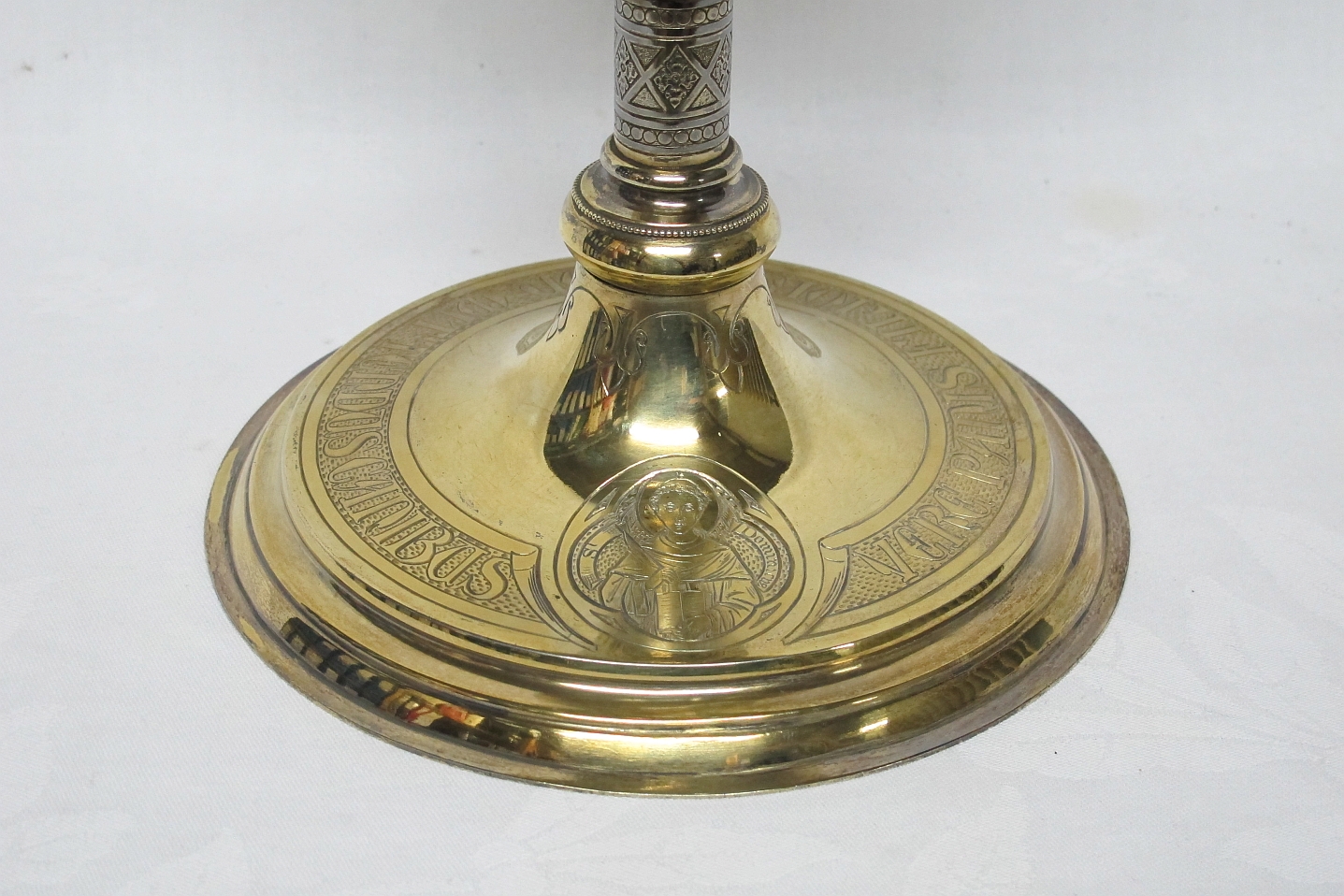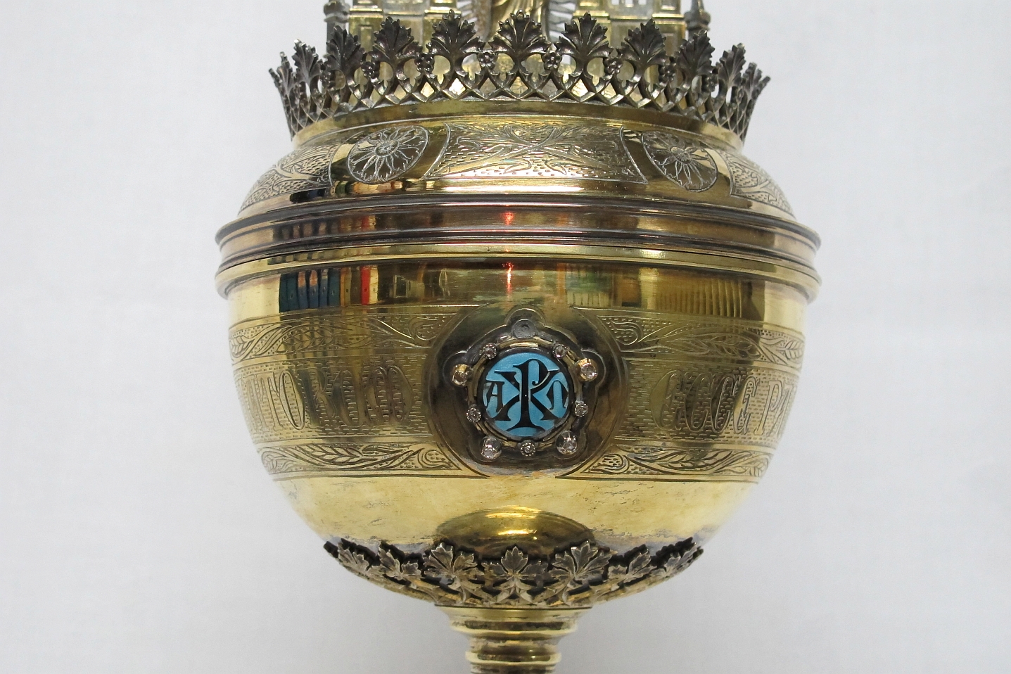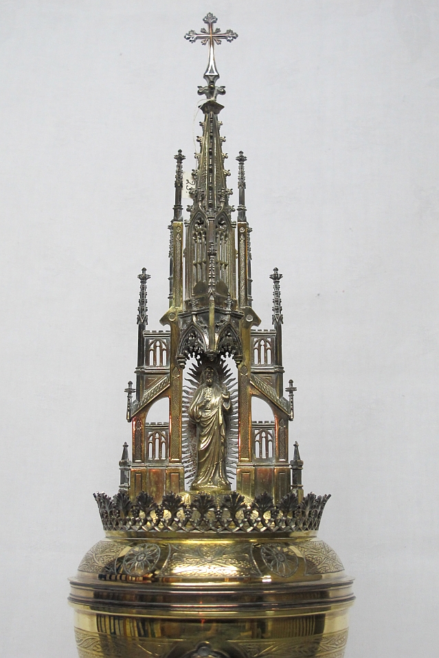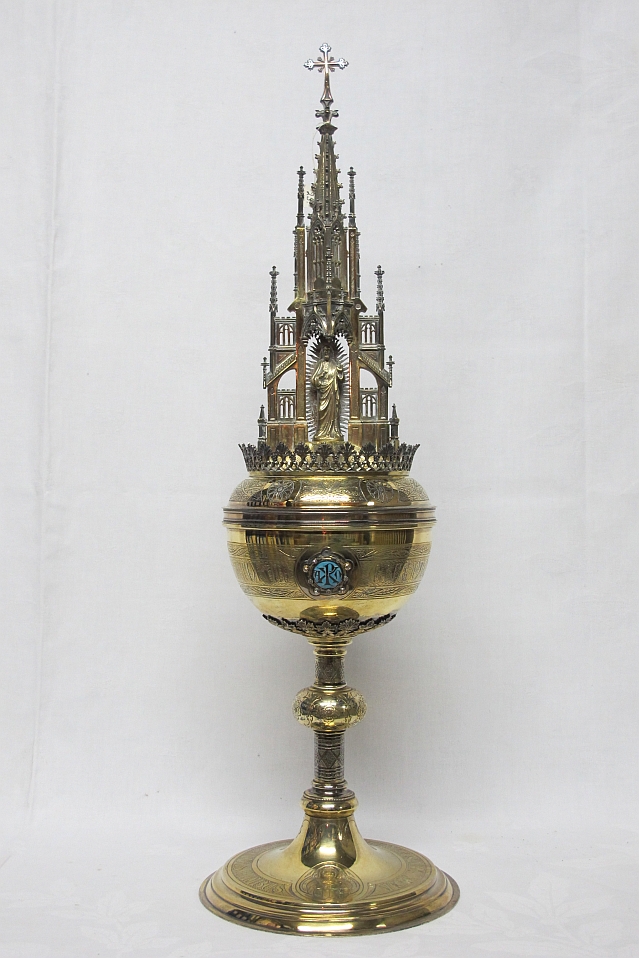 Ciborie op ronde voet waarop gegraveerd H. Dominicus, op deksel beeldje van H. Hart Christus