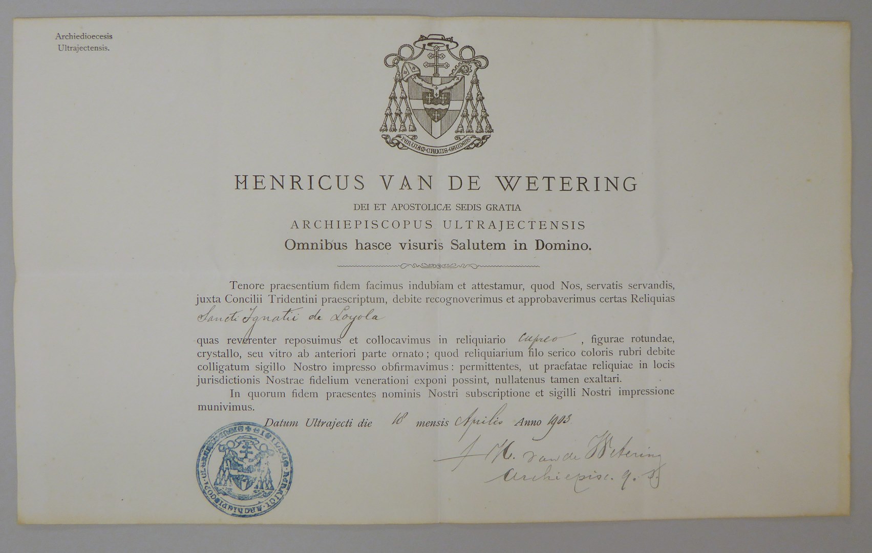 Echtheidsverklaring bij een reliek H. Ignatius van Loyola met "Henricus van de Wetering ..."