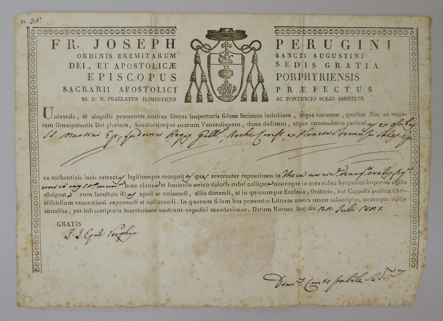 Echtheidsverklaring bij StCC m51a met "Fr. Joseph Perugini ..."
