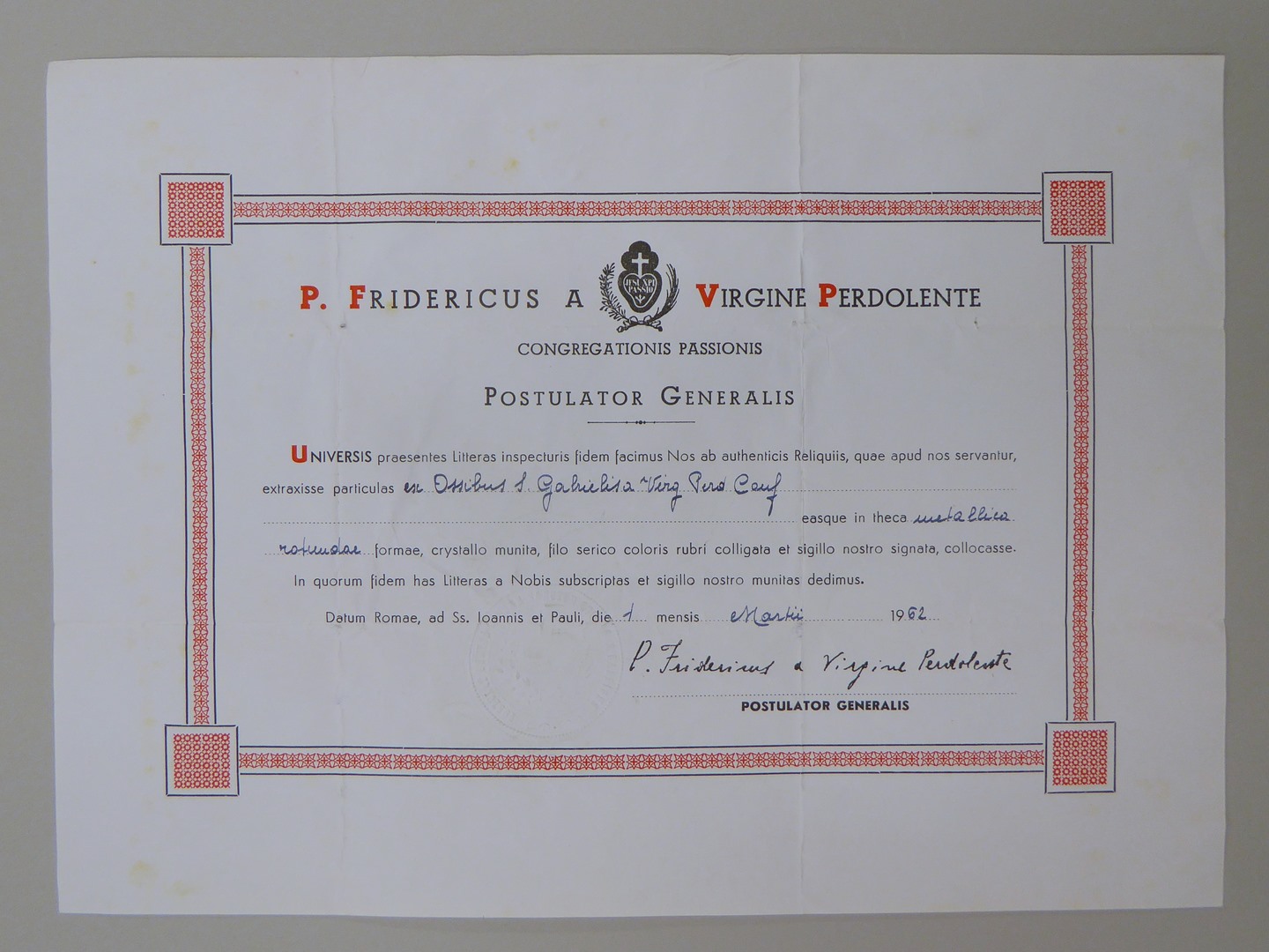 Echtheidsverklaring bij StCC m63a met "P. Fridericus a Virgine Perdolente ..."