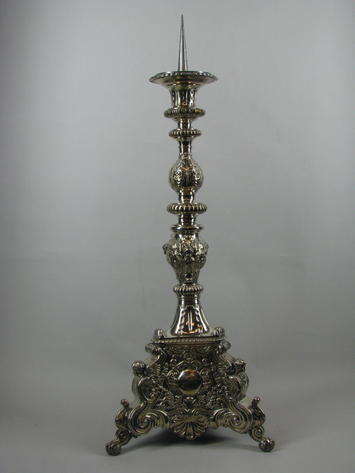 Kandelaar op driezijdige voet met H. Hyacinthus, H. Dominicus en H. Theresa van Avila