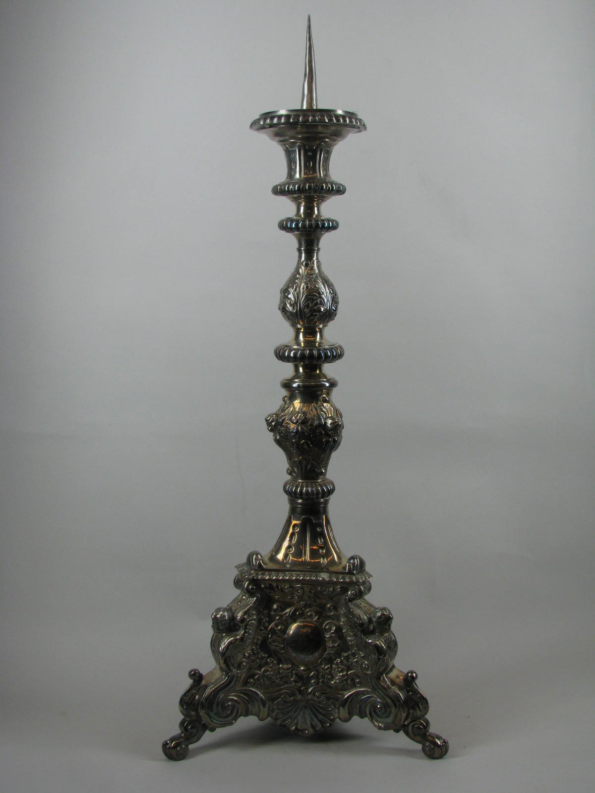 Kandelaar op driezijdige voet met H. Hyacinthus, H. Dominicus en H. Theresa van Avila