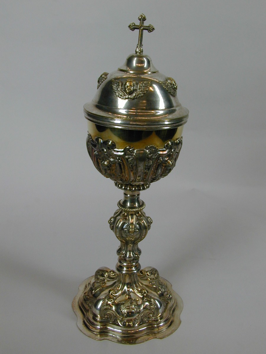 Ciborie op accoladevormige voet met symbolen en namen van vier evangelisten, Veronicadoek op cuppa