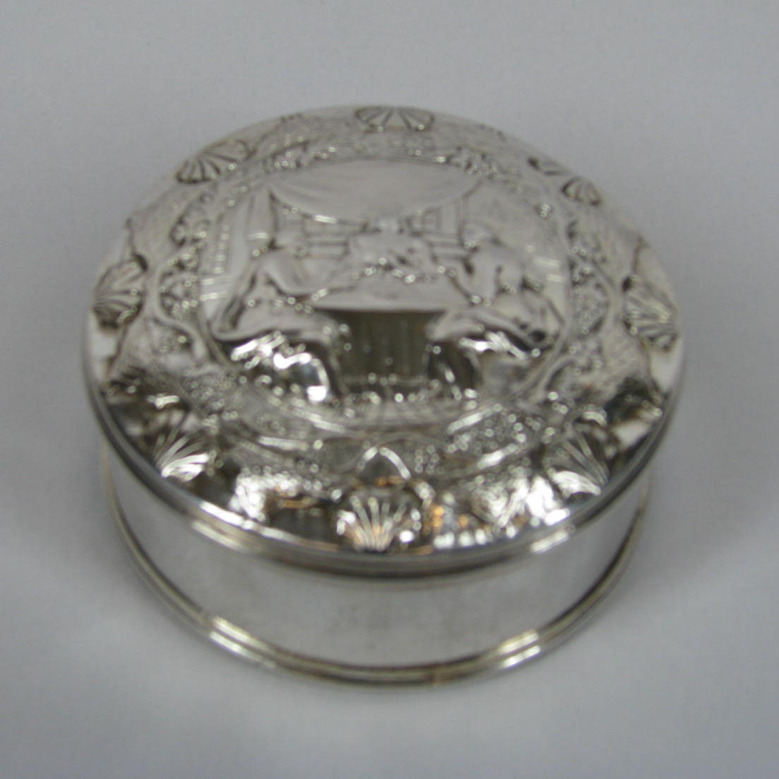 Ronde lunuladoos met op deksel in drijfwerk de Emmausgangers