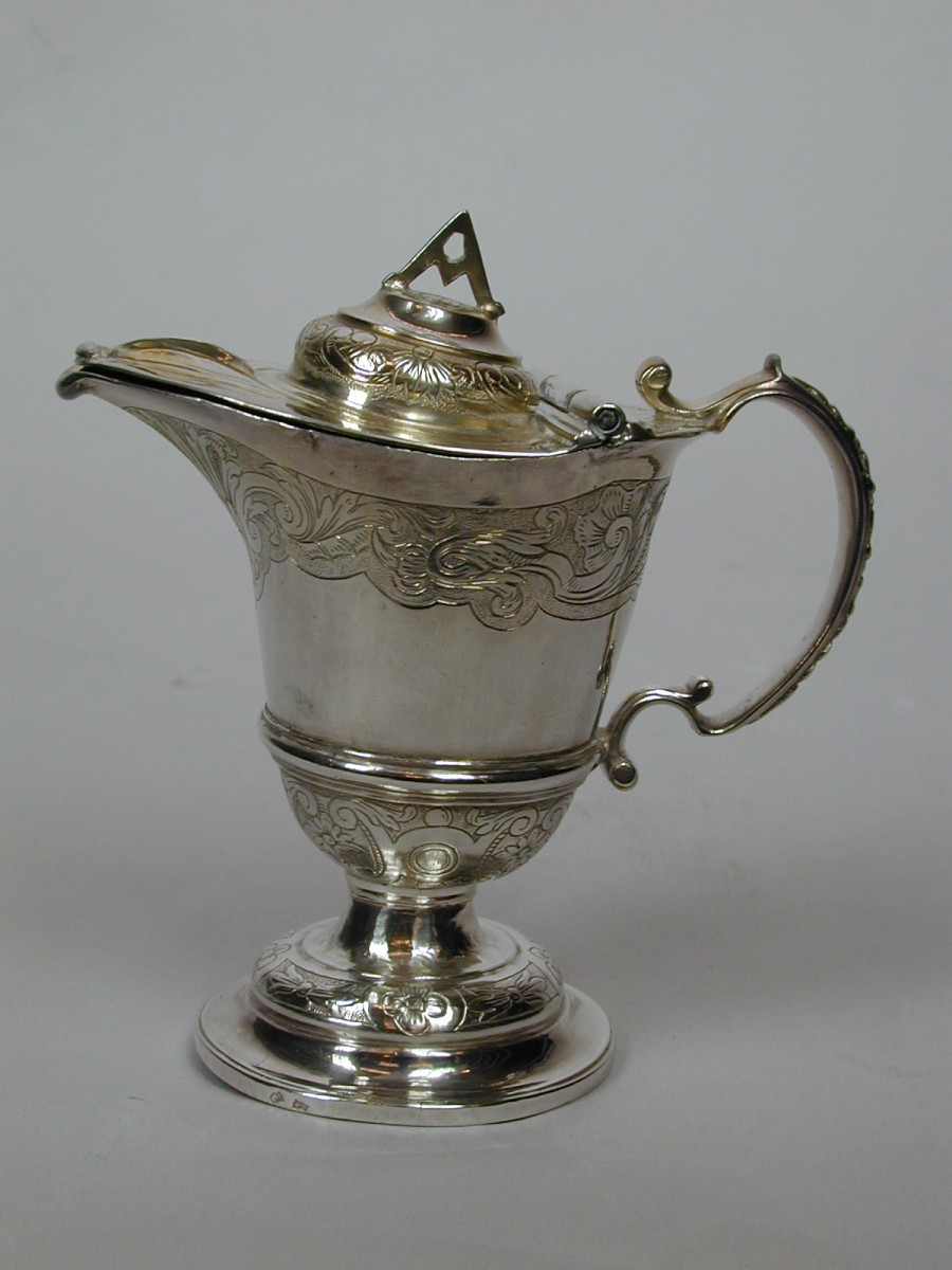 Ampul met ronde geprofileerde voet, gegraveerd met bloem- en bladmotieven met "A" op deksel