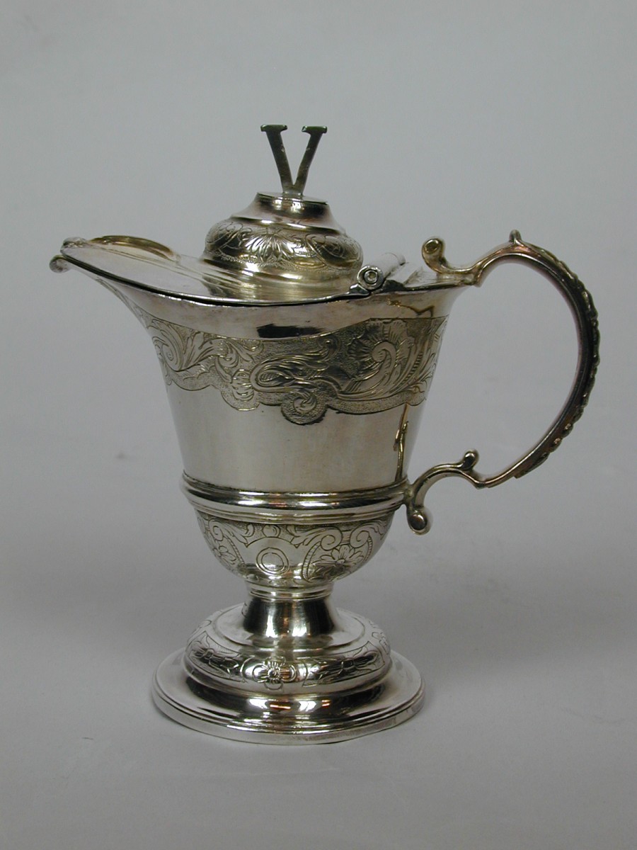 Ampul met ronde geprofileerde voet, gegraveerd met bloem- en bladmotieven met "V" op deksel