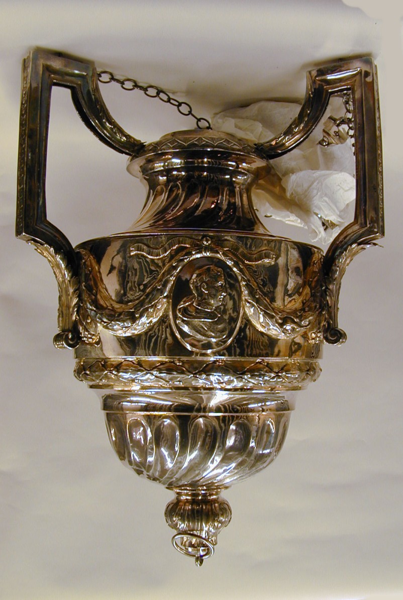 Godslamp met medaillons waarin Thomas van Aquino, Dominicus(?) en Maria