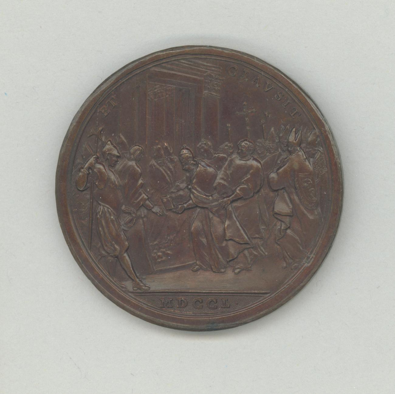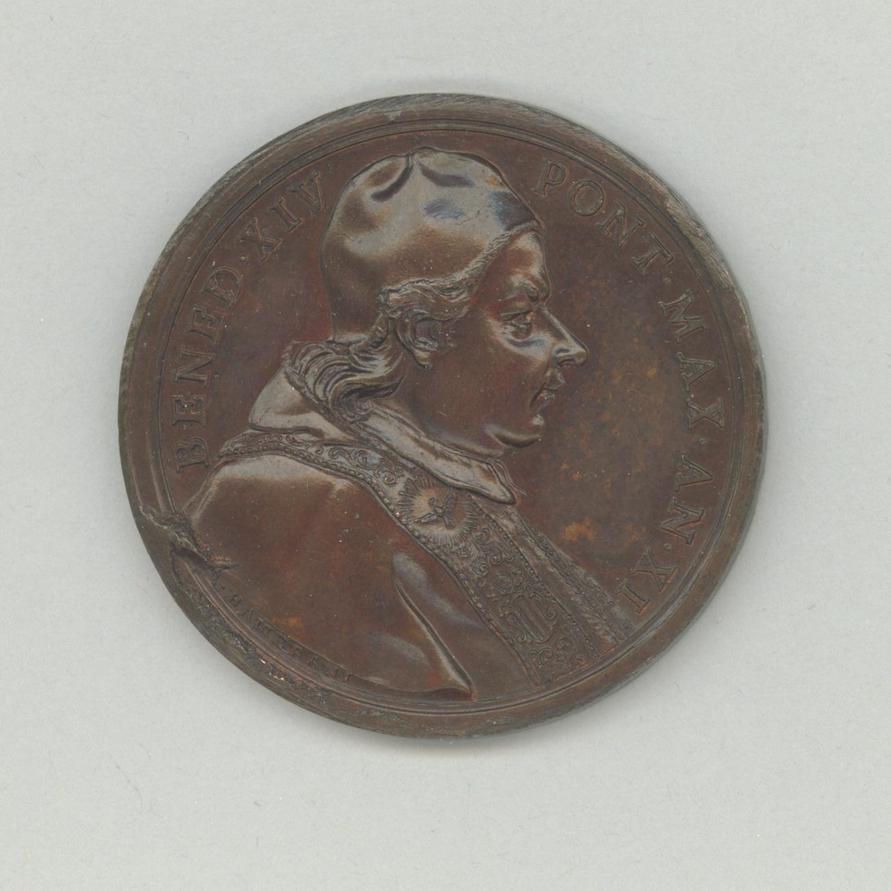 Pauspenning met portret paus Benedictus XIV (1740-1758), met "... AN XI", kz. paus metselt H. Deur dicht