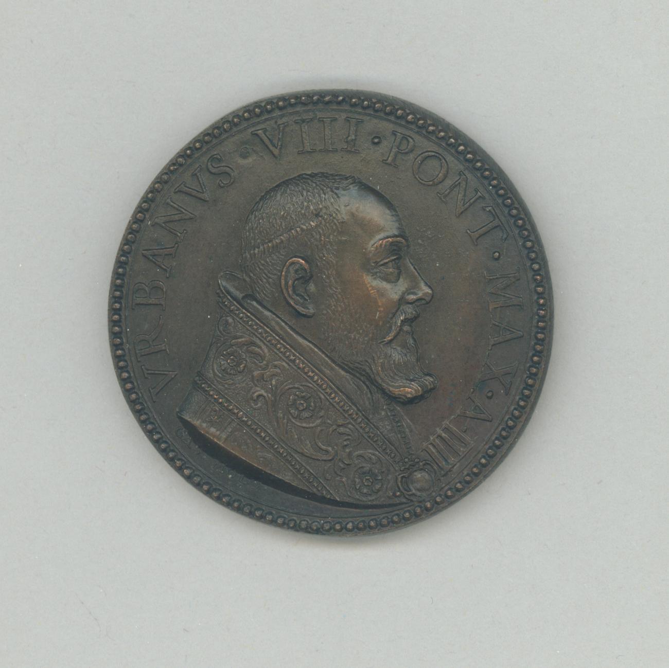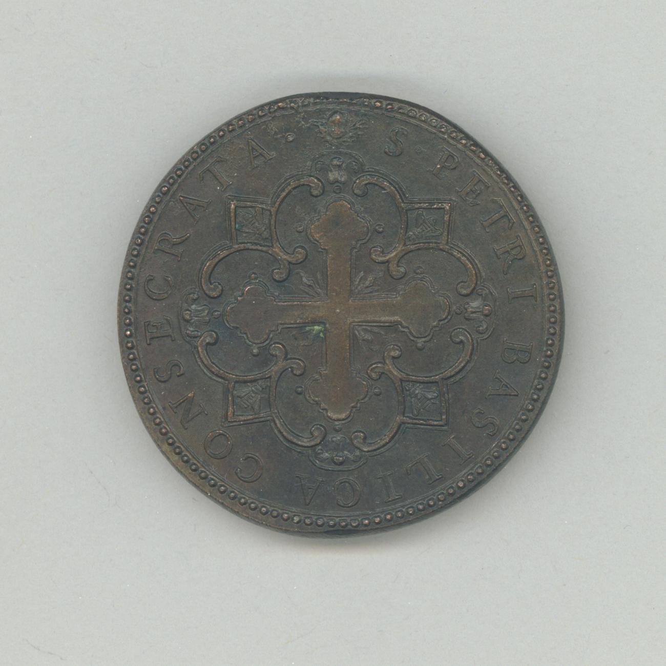 Pauspenning met portret paus Urbanus VIII (1623-1644), met "... A IIII", kz. kruis met "Consecrata s. Petri basilica"