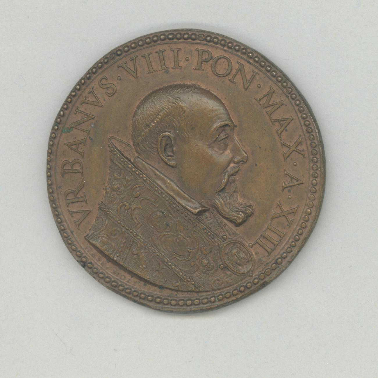 Pauspenning met portret paus Urbanus VIII (1623-1644), met "... A XIII", kz. gevel van de kerk St. Anastasia