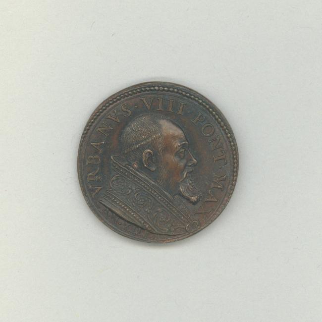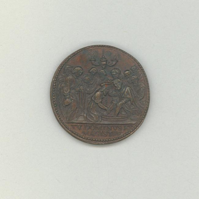 Pauspenning met portret paus Urbanus VIII (1623-1644), kz. voetwassing, Christus wast voeten van Petrus, apostelen rondom