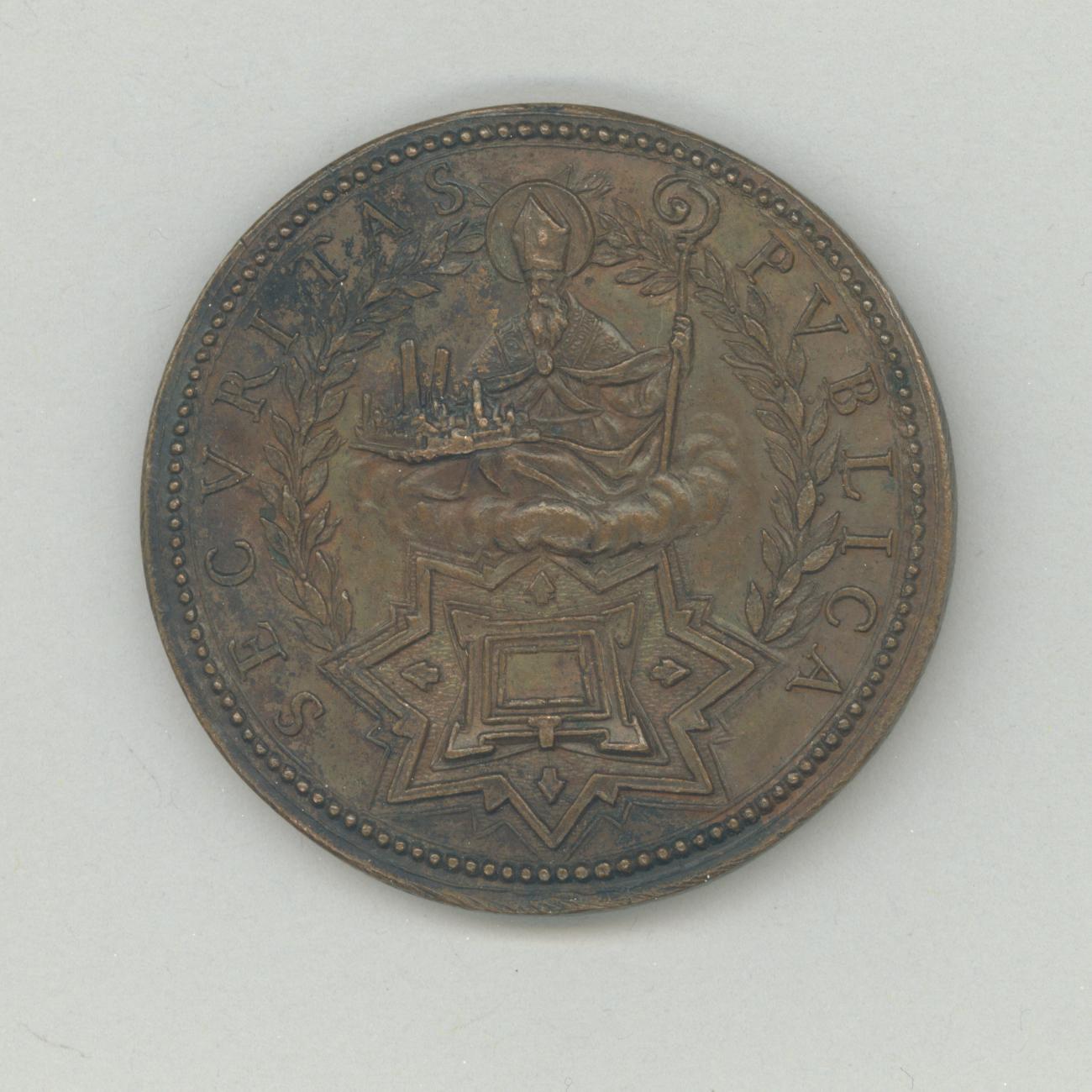 Pauspenning met portret paus Urbanus VIII (1623-1644), kz. St. Petronius op wolk gezeten draagt Bologna in zijn hand, hieronder burcht Urbanus om Bologna te beschermen